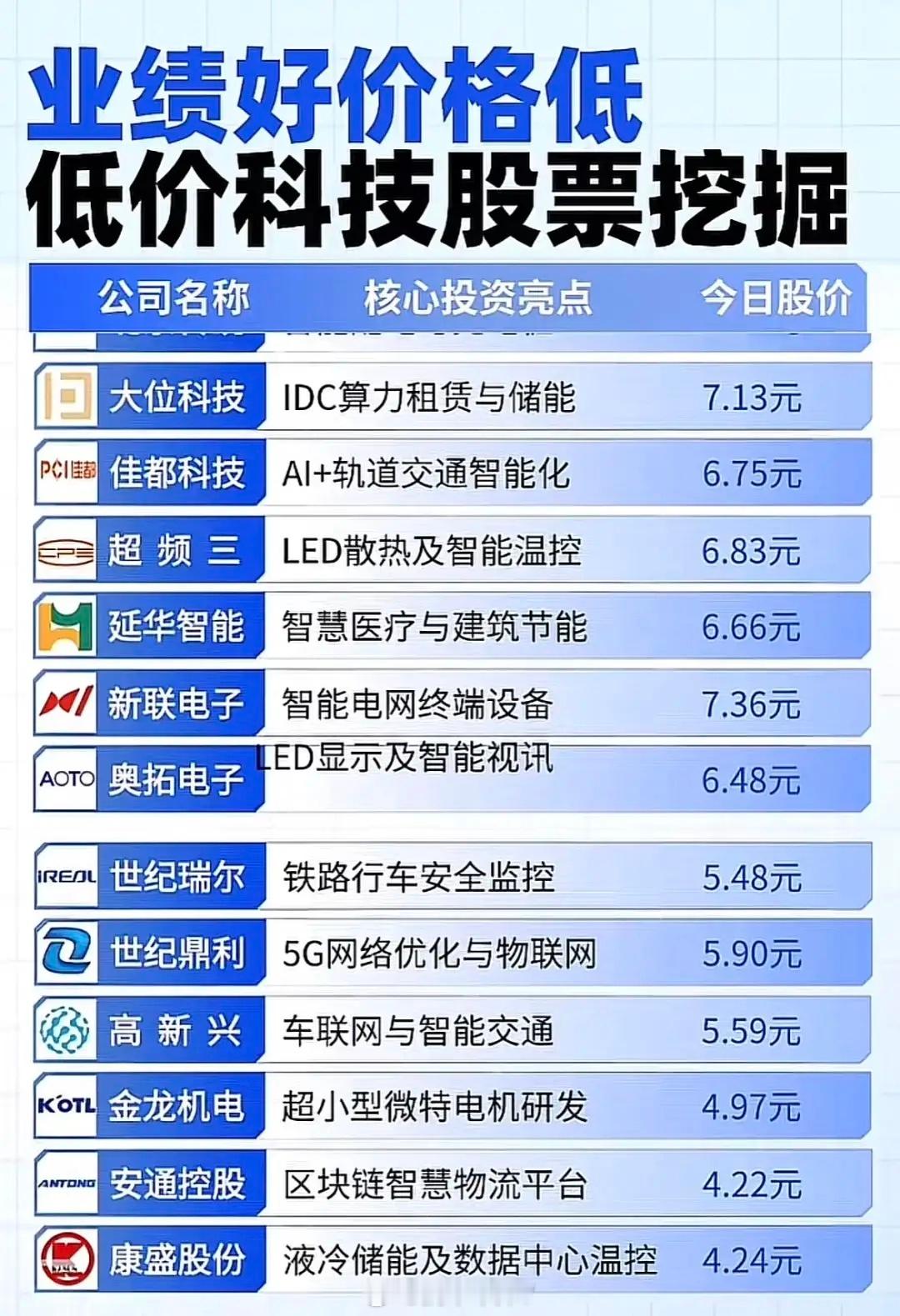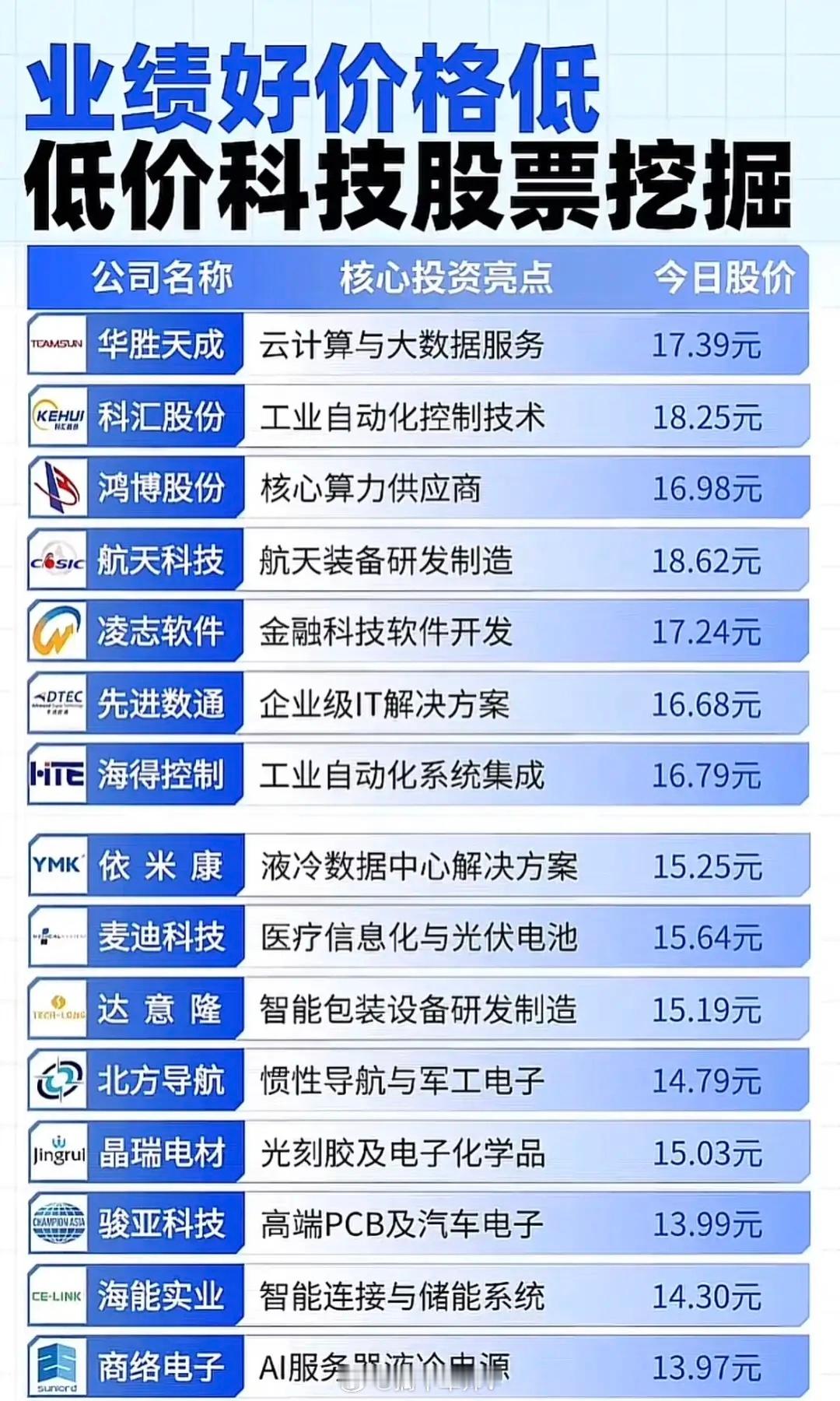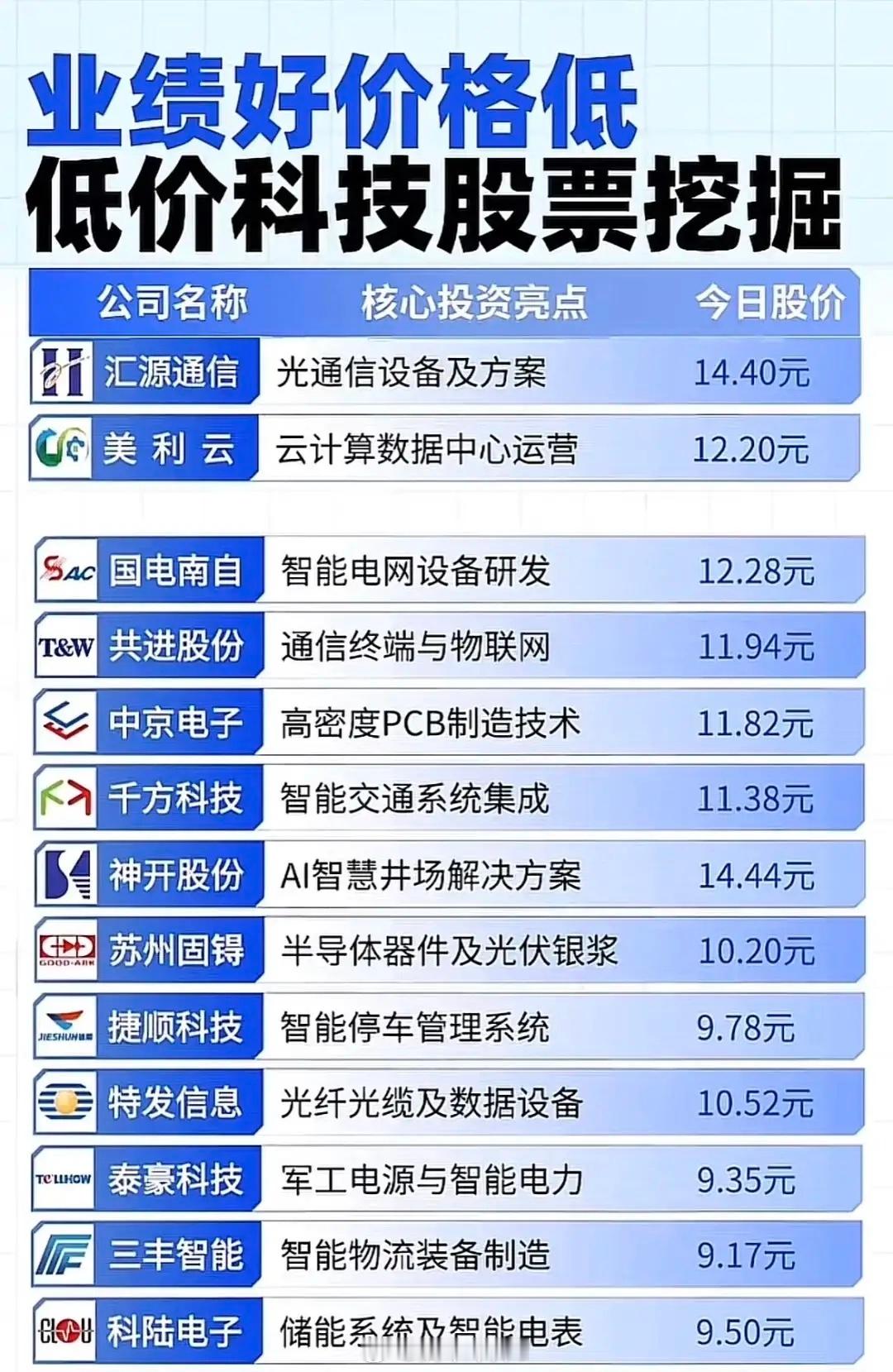 每张图片中列出的公司都标明了其核心投资亮点与最新的每股价格,股价范围大致在4元多至23元多之间,整体偏向低价区间,意在挖掘“业绩尚可但估值较低”的科技类标的,为投资者提供潜在关注对象。