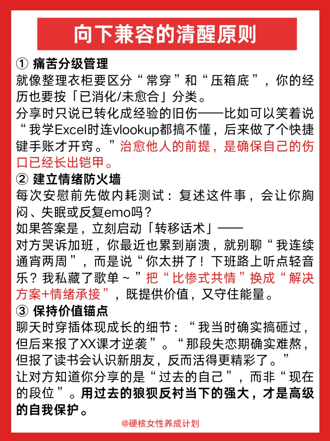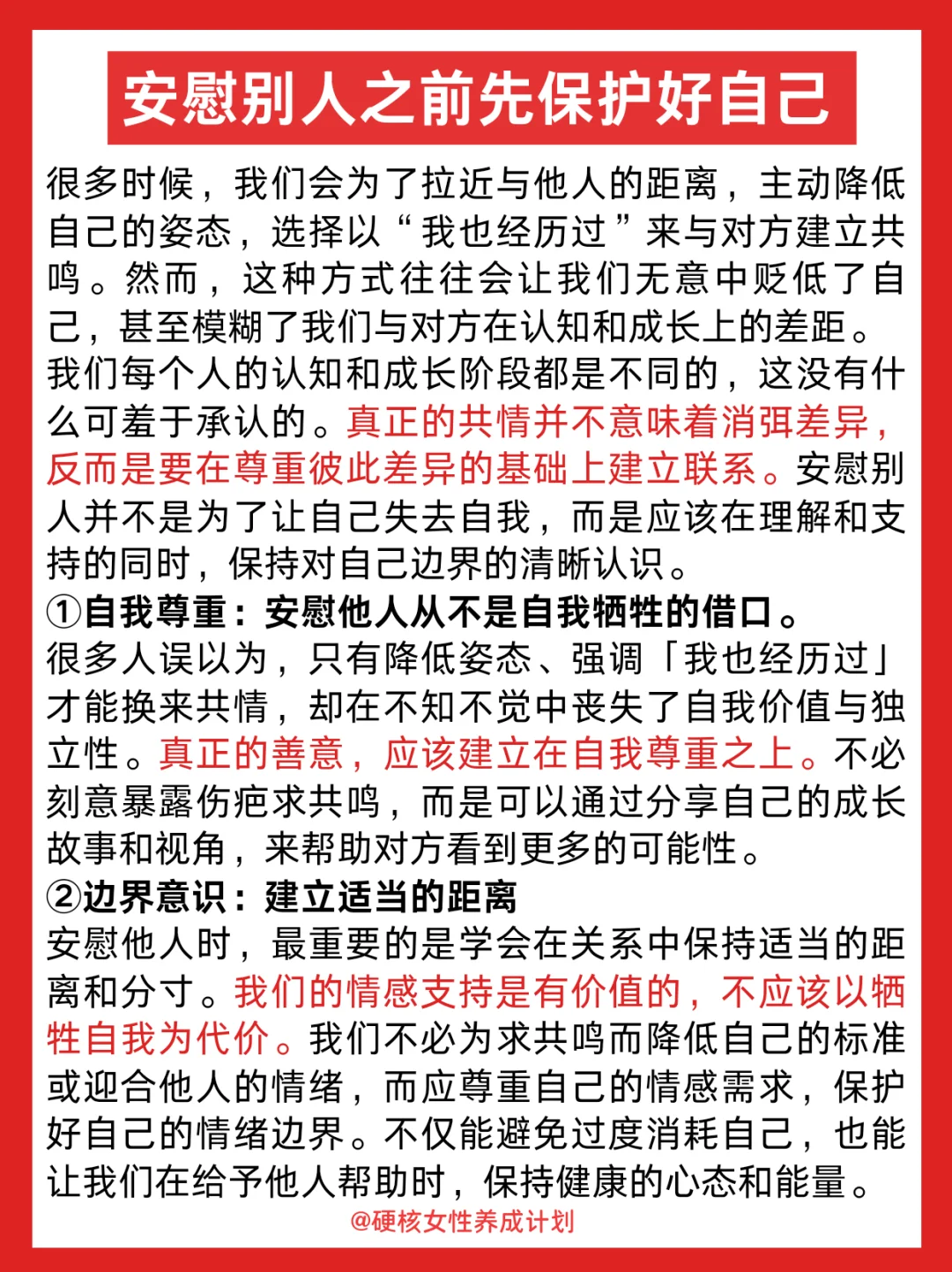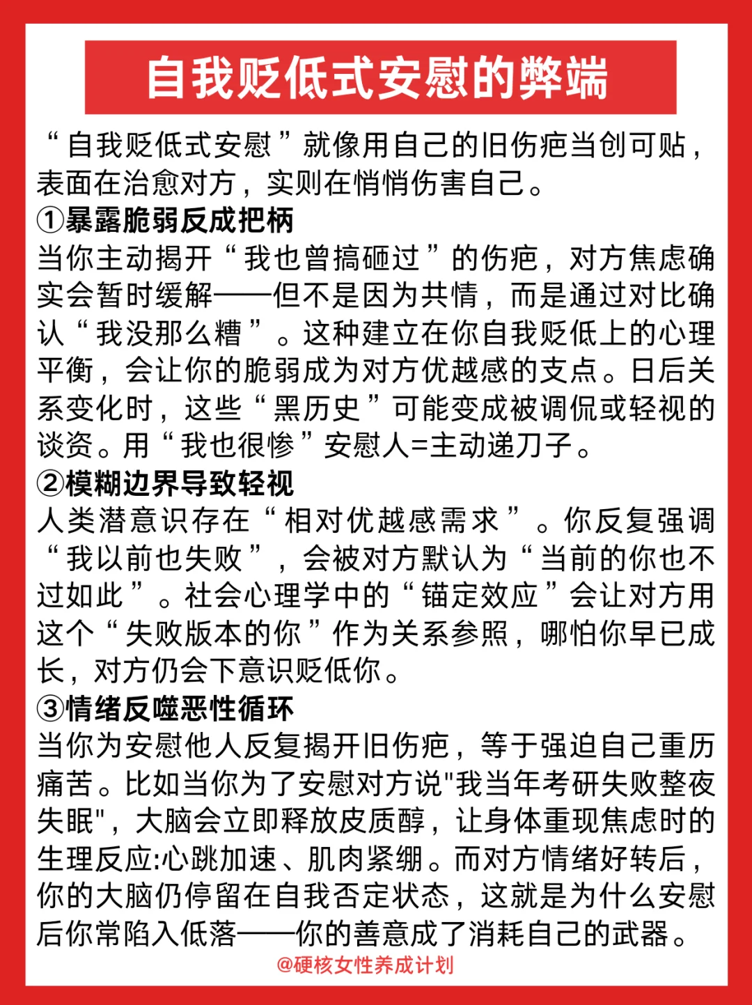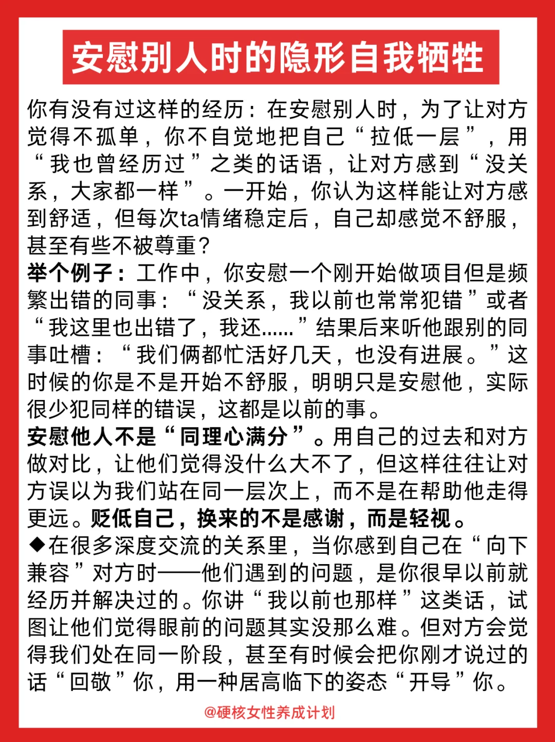 我们总以为「我也这样」能拉近距离 却忘了—— 低谷期的人需要共情 但不需要参照物证明你比他更惨 那些刻意暴露的"黑历史" 在对方眼里可能变成把柄 等他情绪好转,反而用你的伤疤攻击你 你熬过的苦不该成为讨好的筹码 保持清醒的善意才能被尊重