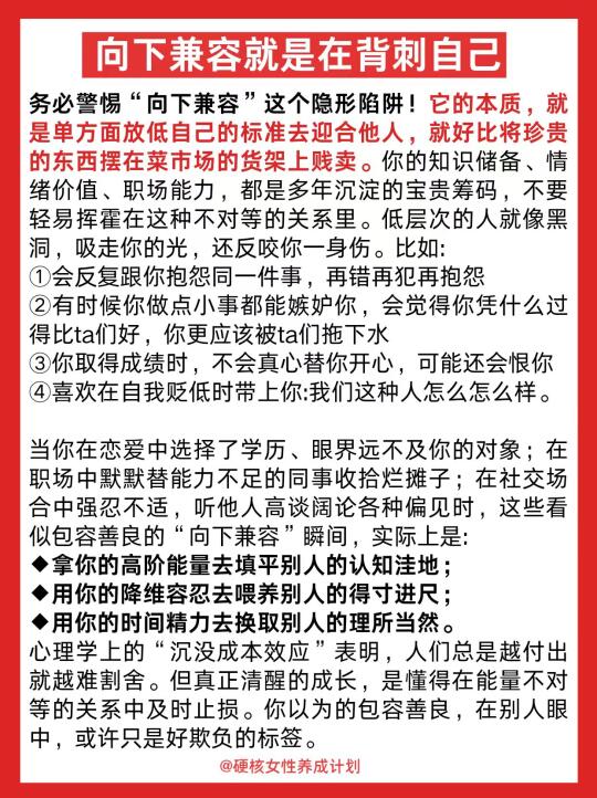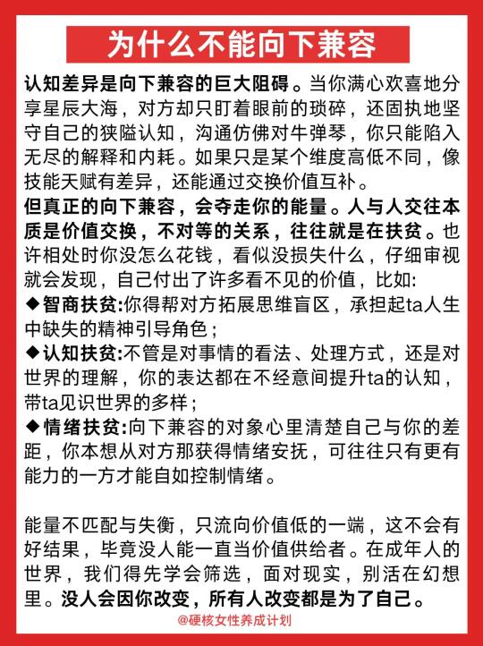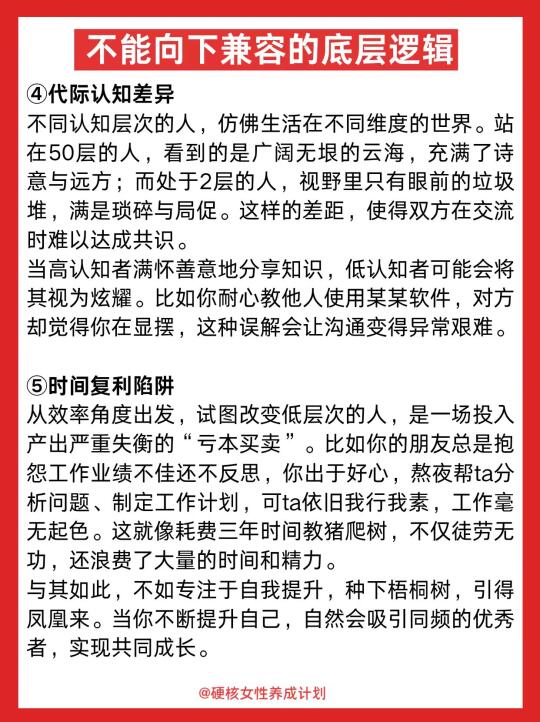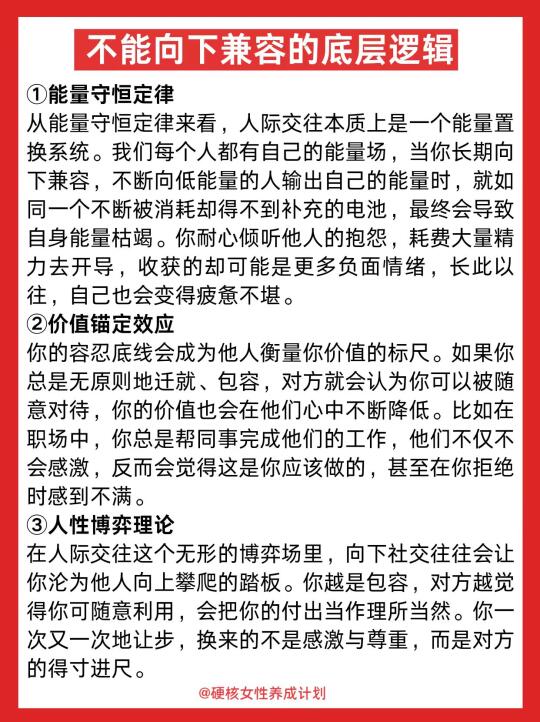 永远不要向下兼容,那是在用自己的人生给别人的低配买单。当你停止兼容100个low人,就能吸引10个同频者,遇见1个贵人。 ✨千万别让别人的低配人生背刺你自己!要知道: 雌鹰从不教麻雀飞翔 凤凰不会与鸡争食 你要做的 是飞去属于自己的天空 真正的贵气也不是背爱马仕 而是敢于对低配人生说"此路不通" 当你停止在沼泽里种玫瑰 星辰大海自会奔你而来~