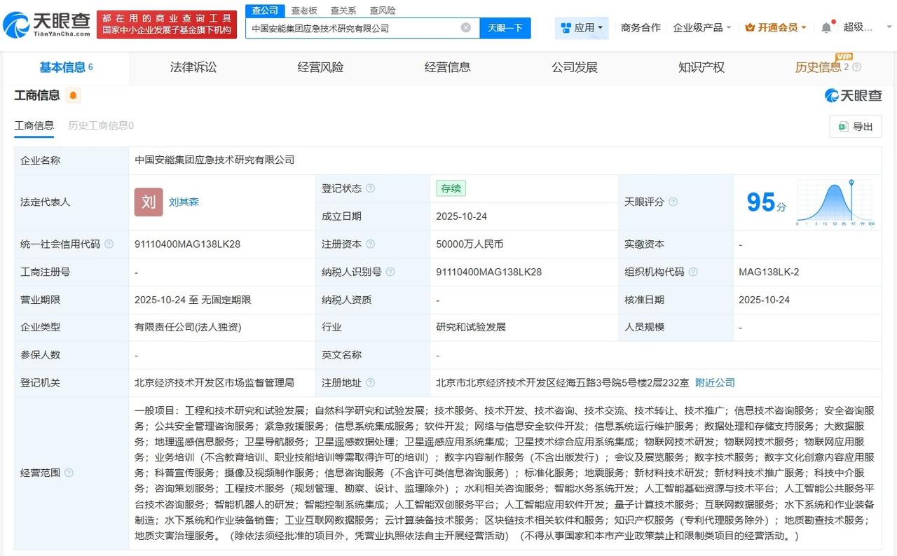 中国安能集团成立应急技术研究公司注册资本5亿 天眼查App显示,近日,中国安能集团应急技术研究有限公司成立,法定代表人为刘其森,注册资本5亿人民币,经营范围包括工程和技术研究和试验发展、自然科学研究和试验发展、智能机器人的研发、智能控制系统集成等。股东信息显示,该公司由中国安能建设集团有限公司全资持股。 天眼查信息:
