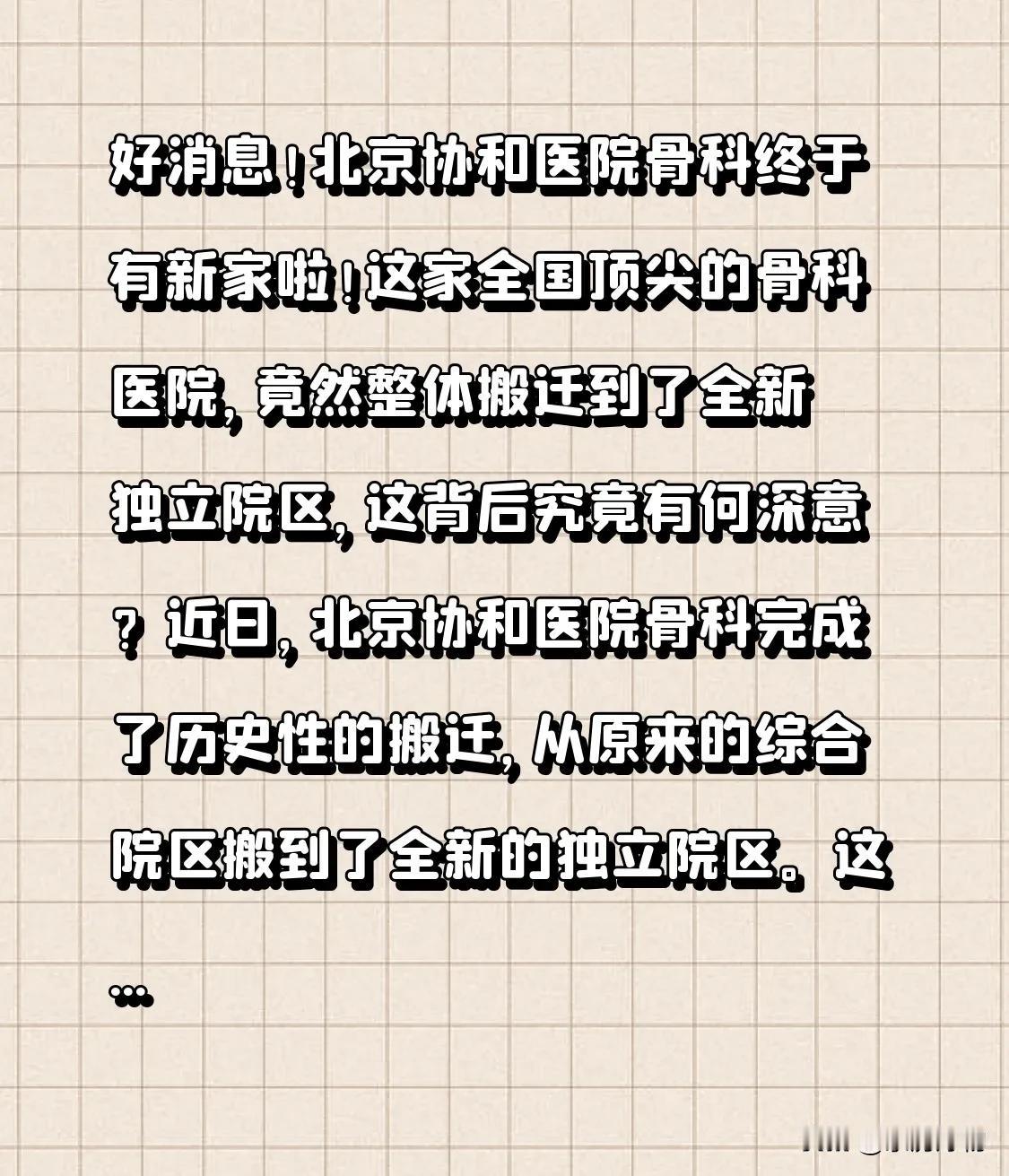 好消息!北京协和医院骨科终于有新家啦!这家全国顶尖的骨科医院,竟然整体搬迁到了全新独立院区,这背后究竟有何深意? 近日,北京协和医院骨科完成了历史性的搬迁,从原来的综合院区搬到了全新的独立院区。这个新院区不仅地理位置优越,交通十分便利,而且环境优雅,设施一流。据悉,新院区在规划时就充分考虑了骨科患者的特殊需求,从病房设计到康复区域,都体现了人性化的关怀。比如,病房采用了宽敞明亮的布局,配备了先进的医疗设备,让患者在舒适的环境中接受治疗。同时,新院区还设有专门的康复中心,提供个性化的康复方案,帮助患者更快更好地恢复健康。这次搬迁不仅提升了患者的就医体验,也标志着协和骨科在医疗技术和服务水平上又迈上了一个新的台阶。 协和骨科医院的新家,无疑将为患者带来更加优质的医疗服务。对于这次搬迁,你有什么看法呢?快来评论区留言,和大家一起分享你的观点吧! 北京协和医院 北京骨科 协和就诊 汉口协和医院 协和就医 协和看病记 协和同济医院 京协和医院 &