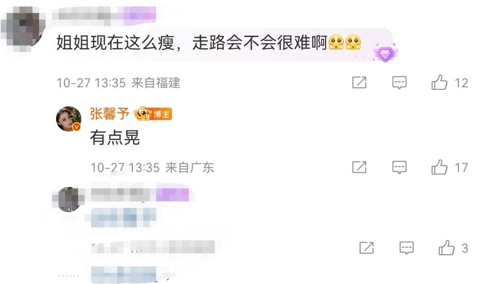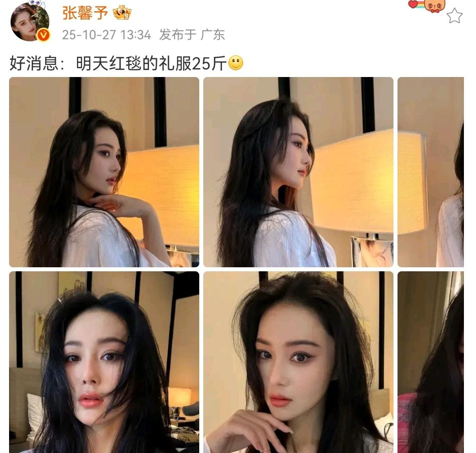张馨予于10月27日发文透露:明天红毯的礼服25斤…… 在评论区有网友问:姐姐现在这么瘦,走路会不会很难啊…… 张馨予回复说:有点晃…… 呵呵,张馨予现在这么瘦,穿25斤的礼服在身上不晃才怪呢!为什么要穿这么重的衣服呢?难道没得选择的吗? 看来,明星走个红毯,也是不容易呀! 我想,张馨予明天走红毯穿的礼服一定很美吧,好期待哟!