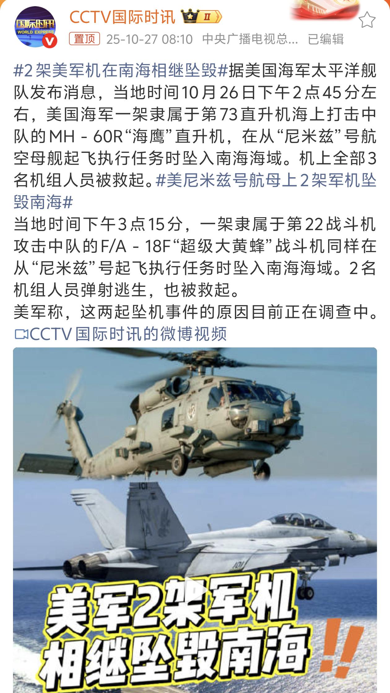 美军直升机和舰载机连续掉海! 南海不是你想来,想来就能来,这下丢份了吧。尼米兹级航空母舰1975年服役,2027年之前彻底退出现役。这也算是尼米兹级航空母舰的最后一次谢幕表演,结果彻底玩砸了,一架直升机和一架大黄蜂舰载机,就这么坠落大海。 好在两架飞机的人员,全部都被救出来了,没有造成人员伤亡,这是两架战机就这么连续坠入大海当中,捞也捞不出来了。 此刻东盟峰会,正在进行桌面上的谈判,也是紧锣密鼓的展开,谁此刻在南海占据优势,谁的谈判就要更猛烈,更占优势。结果美国一次性就摔了两架飞机,还好意思谈判吗?赶紧俯首称臣和服软比较好。 至于怎么摔的,这里不去讲究了,美国就说会要调查原因,也不可能有真正的原因,最多也就是机械故障,还能说什么?总不能说是被别人电磁干扰,导致无法降落,肯定不能说,只能说机械故障或者是操作失误。 水平就在那搁着呢,只能说尼米兹航空母舰的落幕表演,彻底砸锅了,一艘服役半个世纪的航空母舰,晚节不保,也是没办法了。