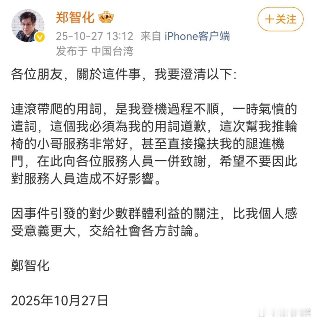 郑智化为用词连滚带爬道歉郑智化道歉 10月27日,发文称:“连滚带爬的用词是我登机过程不顺,一时气愤的遣词,这个我必须为我的用词道歉。这次帮我推轮椅的小哥服务非常好,甚至直接搀扶我的腿进机舱门,在此向各位服务人员一并致谢,希望不要因此对服务人员造成不好影响。”