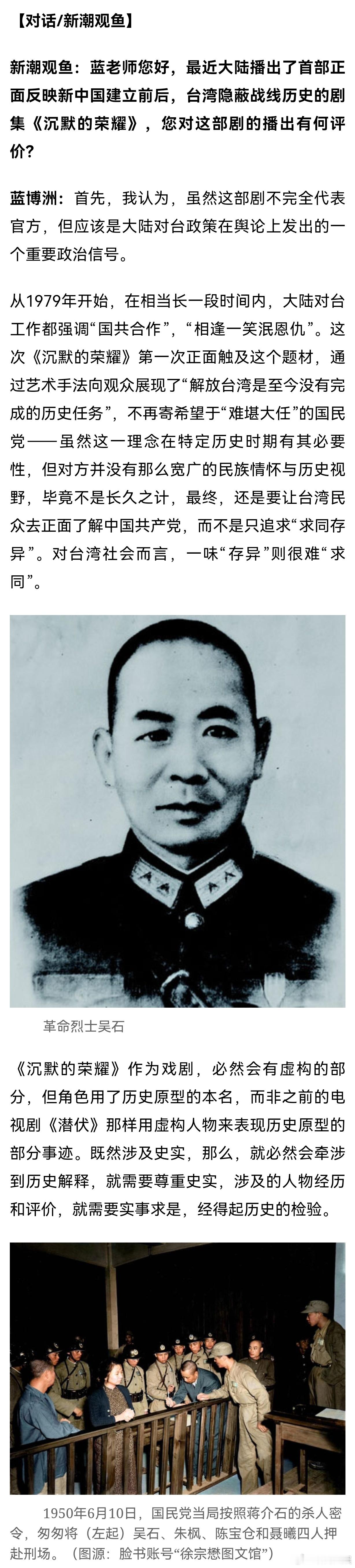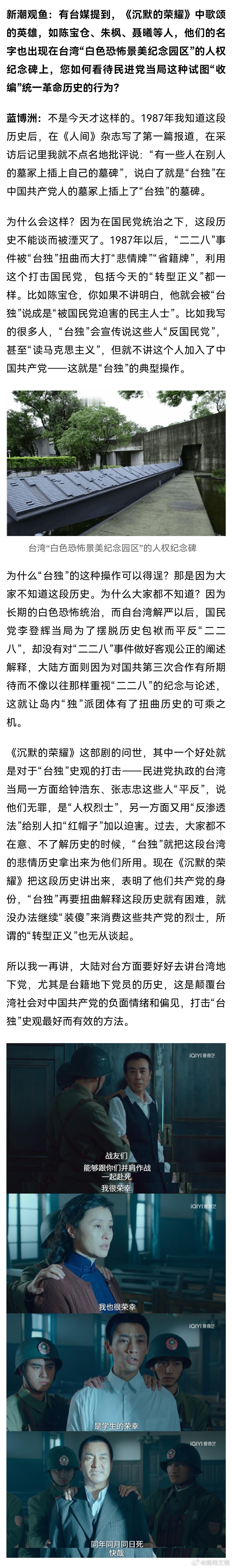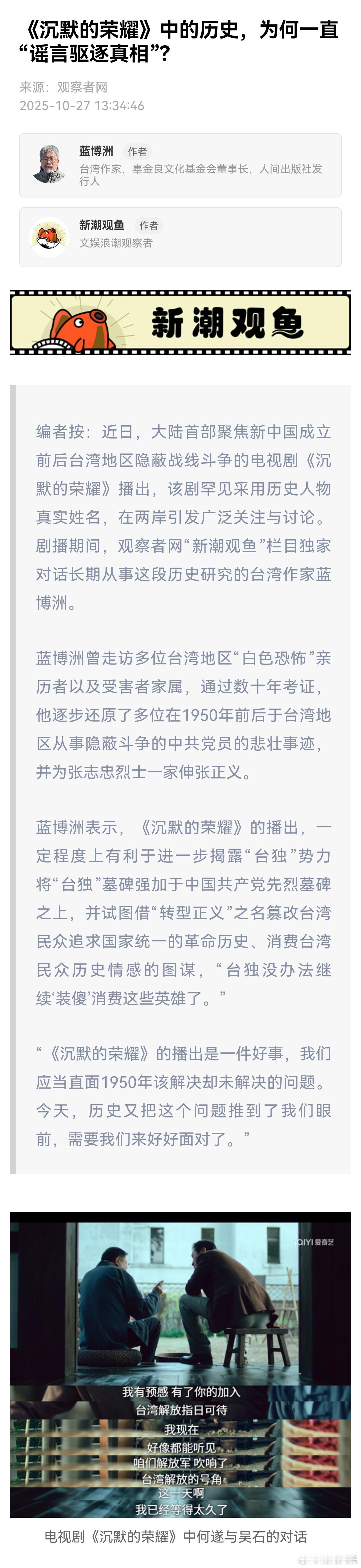 【《沉默的荣耀》中的历史,为何一直“谣言驱逐真相”?】沉默的荣耀是对台独史观的正面打击蔡孝乾吃牛排被捕是特务谷正文杜撰吗近日,大陆首部聚焦新中国成立前后台湾地区隐蔽战线斗争的电视剧《沉默的荣耀》播出,该剧罕见采用历史人物真实姓名,在两岸引发广泛关注与讨论。剧播期间,观察者网“新潮观鱼”栏目独家对话长期从事这段历史研究的台湾作家蓝博洲。