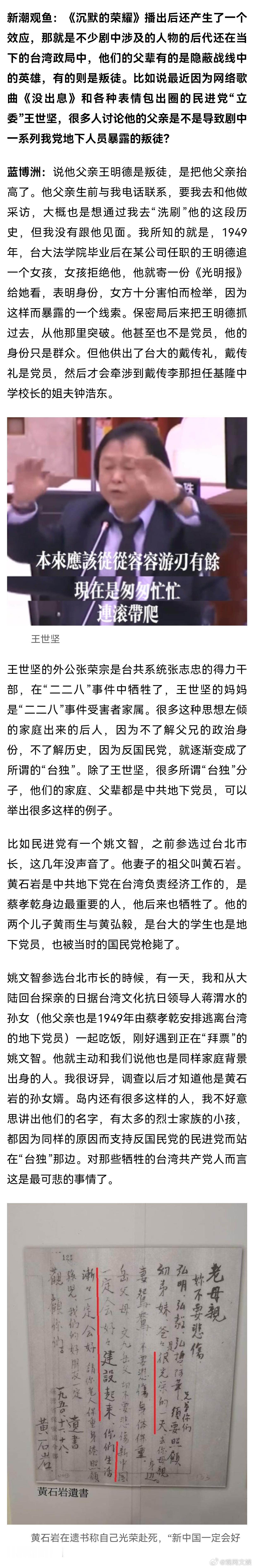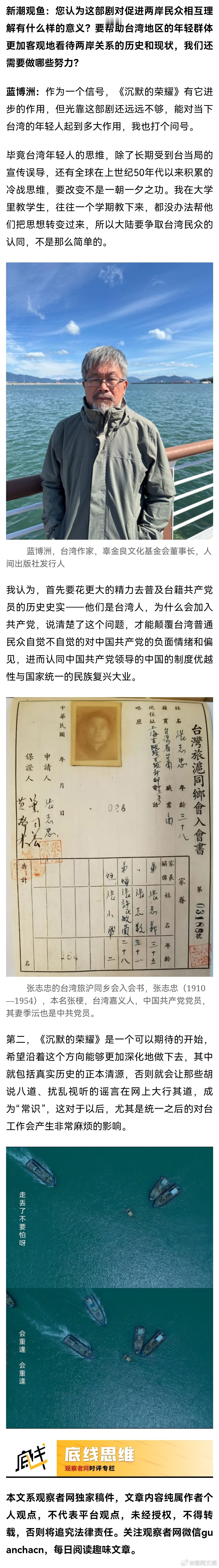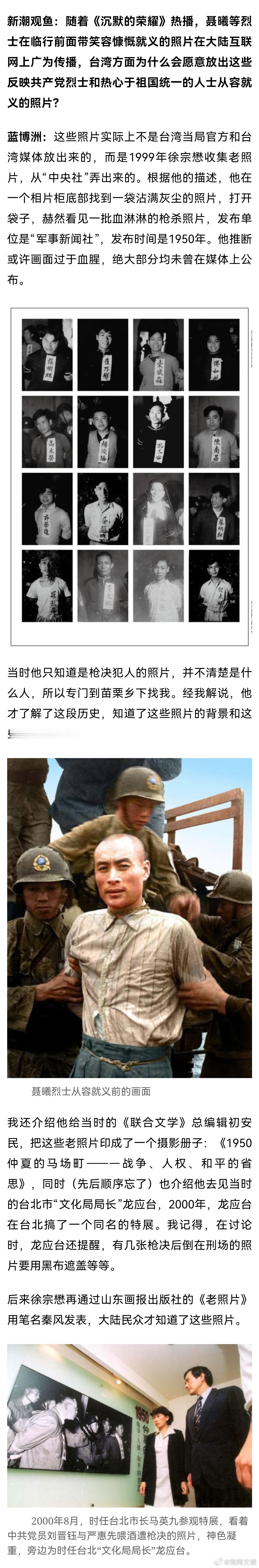 【《沉默的荣耀》中的历史,为何一直“谣言驱逐真相”?】沉默的荣耀是对台独史观的正面打击蔡孝乾吃牛排被捕是特务谷正文杜撰吗近日,大陆首部聚焦新中国成立前后台湾地区隐蔽战线斗争的电视剧《沉默的荣耀》播出,该剧罕见采用历史人物真实姓名,在两岸引发广泛关注与讨论。剧播期间,观察者网“新潮观鱼”栏目独家对话长期从事这段历史研究的台湾作家蓝博洲。