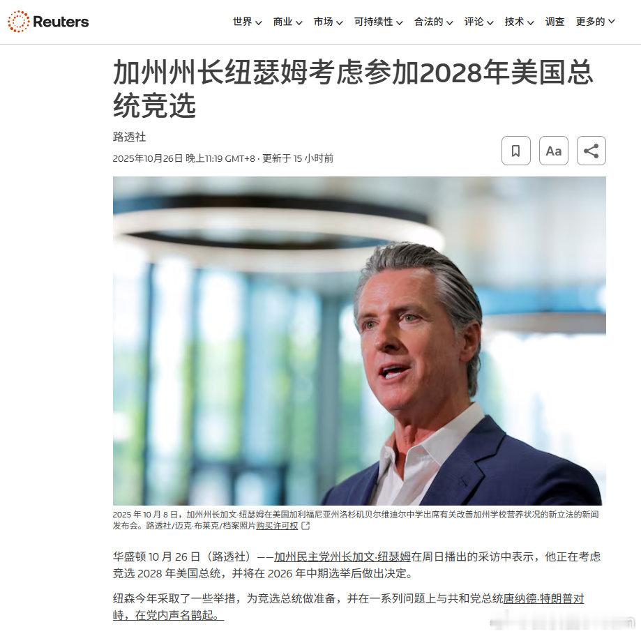🔻加州州长宣布将参加2028年美国总统竞选。