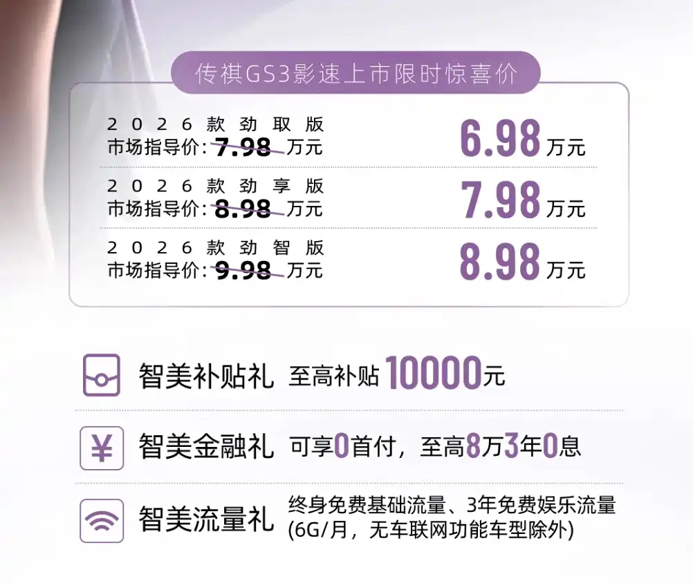 2026款广汽传祺GS3影速上市,限时售6.98万起,中控屏升级到14.6英寸。