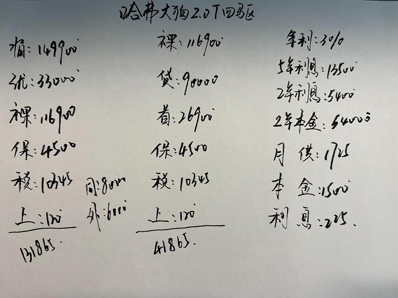 现金优惠33000,2026款哈弗大狗你喜欢吗? 10~15万的预算想买一台方盒子SUV,并且还要具备一定的轻越野能力,我相信很多人会把哈弗大狗纳入到自己的选车范围,结合产品力来看,家用我觉得是值得考虑的,9月份哈弗大狗的销量达到了17,000多台,位于紧凑型SUV销量排行榜的第4名,足以能够说明消费者对它很认可,如果你打算贷款买车,考虑到月供以及养车成本,建议稳定月薪不要低于6000元。 粉丝要购买的这款车型是2026款2.0T四驱中华田园犬版,整车外观延续了2024款车型的设计,前脸采用了全新的设计语言,中网造型更加简洁精致,内部使用了6个黑色长方形装饰,经典的圆形LED头灯组辨识度十足,并集成了日间行车灯,下包围使用了非常粗壮的黑色装饰,左右两侧保留了雾灯设计,下方宽大的银色防刮板,提升了视觉重心。 该车的长宽高分别为4620毫米,1890毫米,1780毫米,接近角24度,离去角30度,纵向通过角22度,空载最小离地间隙200毫米,搭配中央限滑差速器以及后桥电控机械牙嵌式差速锁,可满足一定程度的轻越野,360度全景影像在停车以及低速转弯时,能够提供很大的帮助,前后轮胎规格均为235/65R18,品牌为固铂,后期更换成本不算太高,车尾的贯穿式尾灯组非常抢眼。 我个人比较喜欢沉稳大气的黑色内饰,并且后期也比较好打理,左右A柱以及副驾驶正前方的面板,都设计有越野拉手,4个空调出风口均采用了长方形设计,10.25英寸全液晶仪表盘可显示信息丰富,皮质多功能方向盘集成了多功能控制以及电子式怀挡,传统档把位置的前方,设计了一个15W的手机无线充电面板,12.3英寸中控屏支持导航,手机互联,蓝牙车载电话,车联网,4g网络,ota升级等功能。 2738毫米的轴距,让它有着不错的前后排空间,皮质座椅宽大舒适,后排配有中央扶手和3个独立的安全头枕,所搭载的2.0T发动机最大功率175kw,最大马力238匹,最大扭矩385牛米,发动机特有技术为米勒循环,可以加92号汽油,与之匹配的是9速湿式双离合变速箱,WLTC百公里综合油耗仅8L左右(图片来源于网络)。