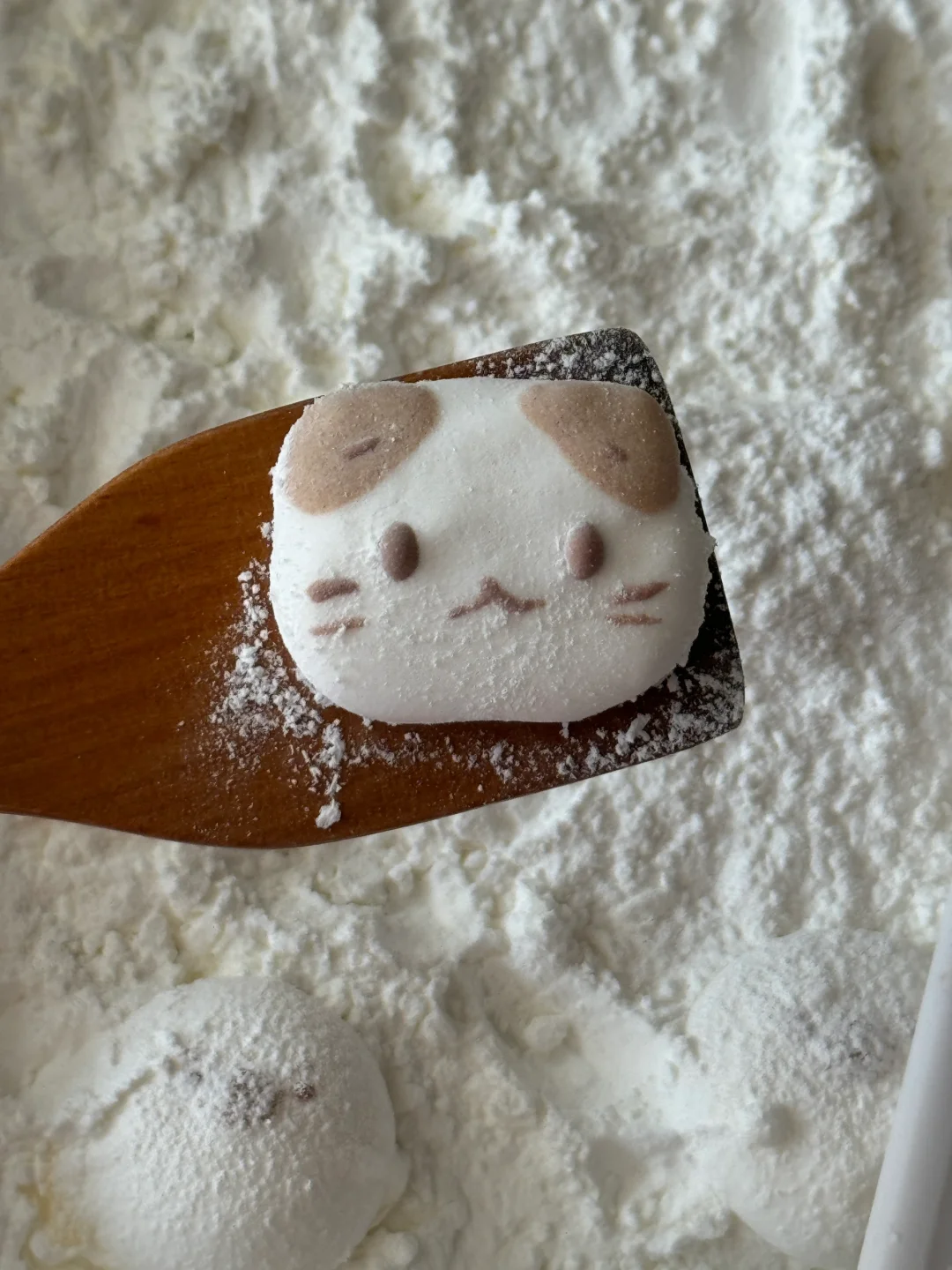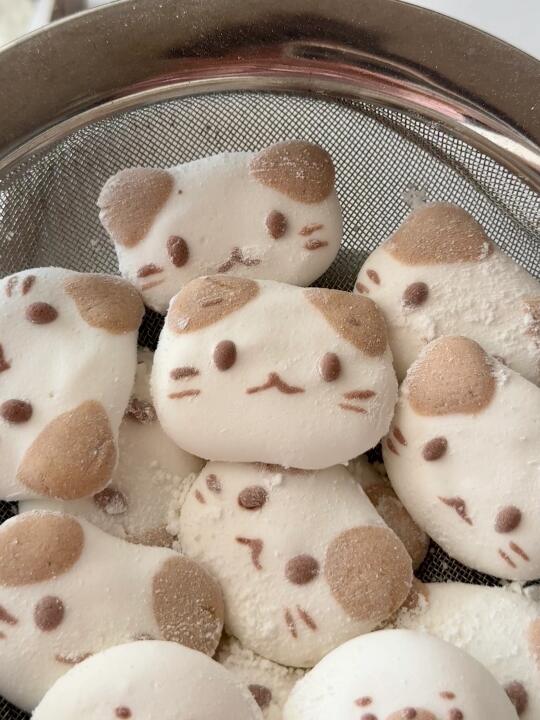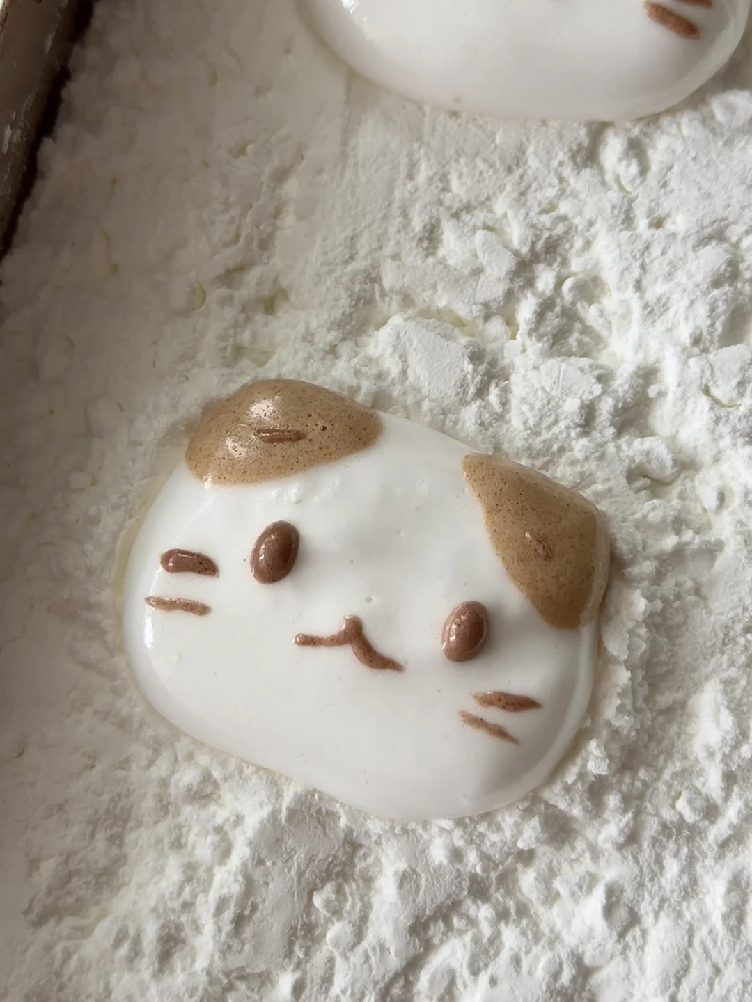 不是捏捏哦 是可以吃的棉花糖猫~ 首次尝试做棉花糖 没想到一次就能成功 做好的棉花糖真的太可爱了 完全不舍得吃! - 材料 糖浆:70g白糖、90g玉米糖浆、40g清水 蛋白霜:无菌蛋蛋清2个、 白糖30g 调色:可可粉、南瓜粉 软化的吉利丁片10g 熟玉米淀粉 步骤: 1️⃣先提前把玉米淀粉在平底锅里炒熟,炒好的玉米淀粉倒入烤盘里晾凉 2️⃣蛋清分3次加入白糖,打到提起有小尖角的状态才行,打好的蛋白霜放冰箱冷藏保存 3️⃣将糖浆里的食材全部倒入小奶锅里,加热到糖水温度有110度,关火加入软化的吉利丁片,用刮刀搅拌均匀 4️⃣将熬好的糖水缓慢的倒入蛋白霜里,边加入糖水边中速打发蛋白,打发到滴落有清晰纹路的状态就可以啦 5️⃣打发好的蛋白霜分一半装入裱花袋里,剩余的分成两份进行调色,深棕(可可粉)、浅棕(可可粉+少量南瓜粉),调好色后装入裱花袋,放在预热38度的烤箱里防止凝固 6️⃣在熟玉米淀粉上就可以开始挤各种造型的棉花糖啦,室温晾大概2个小时左右,表面撒上熟淀粉,用刷子刷掉表面的余粉就可以啦(心急的也可以放冰箱冷藏,加速凝固哦) 剩余的玉米淀粉不要倒掉哦,用密封袋装起来还是可以拿来用的呢