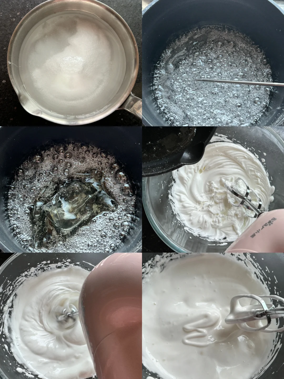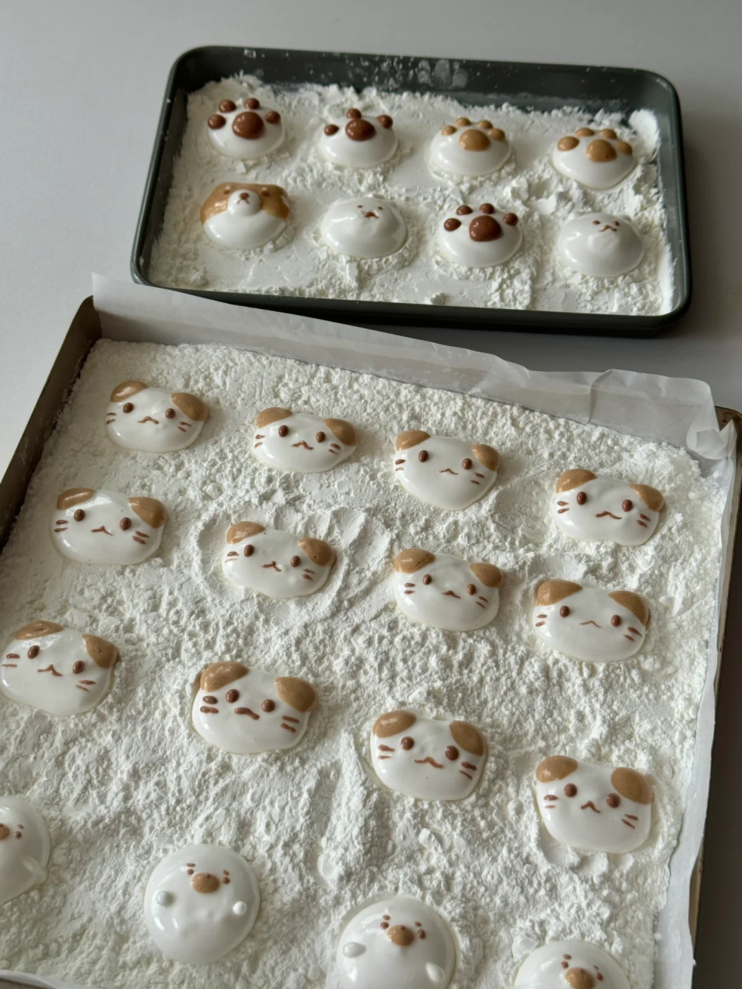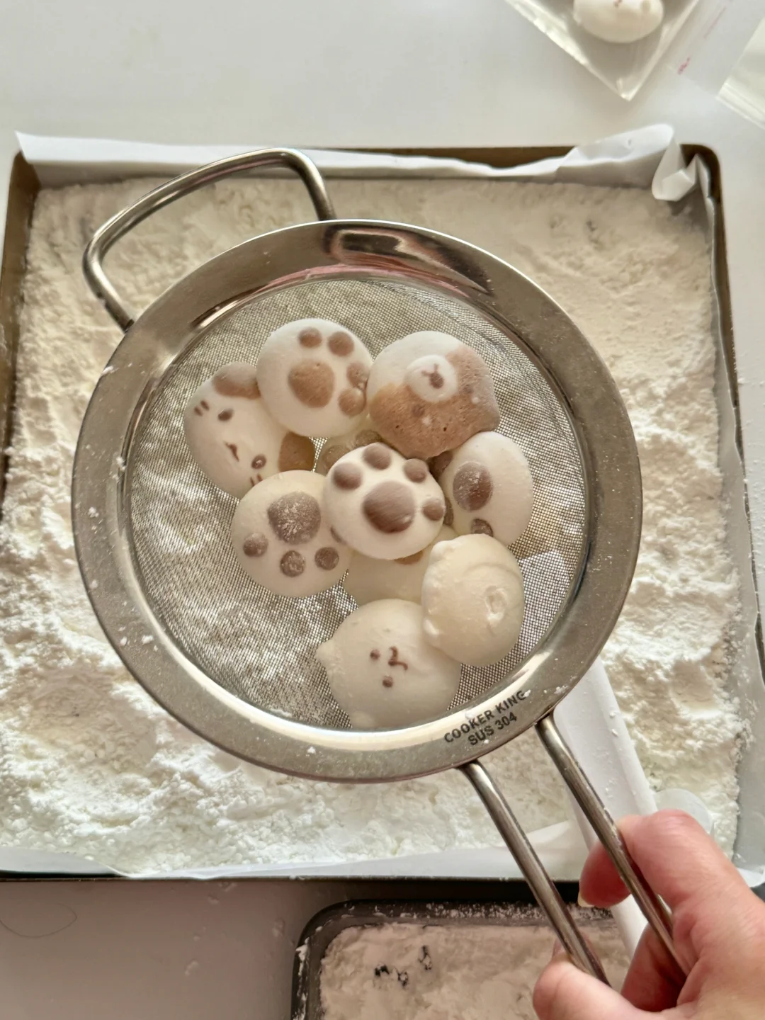 不是捏捏哦 是可以吃的棉花糖猫~ 首次尝试做棉花糖 没想到一次就能成功 做好的棉花糖真的太可爱了 完全不舍得吃! - 材料 糖浆:70g白糖、90g玉米糖浆、40g清水 蛋白霜:无菌蛋蛋清2个、 白糖30g 调色:可可粉、南瓜粉 软化的吉利丁片10g 熟玉米淀粉 步骤: 1️⃣先提前把玉米淀粉在平底锅里炒熟,炒好的玉米淀粉倒入烤盘里晾凉 2️⃣蛋清分3次加入白糖,打到提起有小尖角的状态才行,打好的蛋白霜放冰箱冷藏保存 3️⃣将糖浆里的食材全部倒入小奶锅里,加热到糖水温度有110度,关火加入软化的吉利丁片,用刮刀搅拌均匀 4️⃣将熬好的糖水缓慢的倒入蛋白霜里,边加入糖水边中速打发蛋白,打发到滴落有清晰纹路的状态就可以啦 5️⃣打发好的蛋白霜分一半装入裱花袋里,剩余的分成两份进行调色,深棕(可可粉)、浅棕(可可粉+少量南瓜粉),调好色后装入裱花袋,放在预热38度的烤箱里防止凝固 6️⃣在熟玉米淀粉上就可以开始挤各种造型的棉花糖啦,室温晾大概2个小时左右,表面撒上熟淀粉,用刷子刷掉表面的余粉就可以啦(心急的也可以放冰箱冷藏,加速凝固哦) 剩余的玉米淀粉不要倒掉哦,用密封袋装起来还是可以拿来用的呢