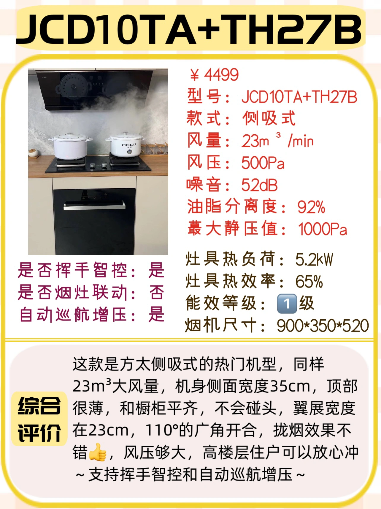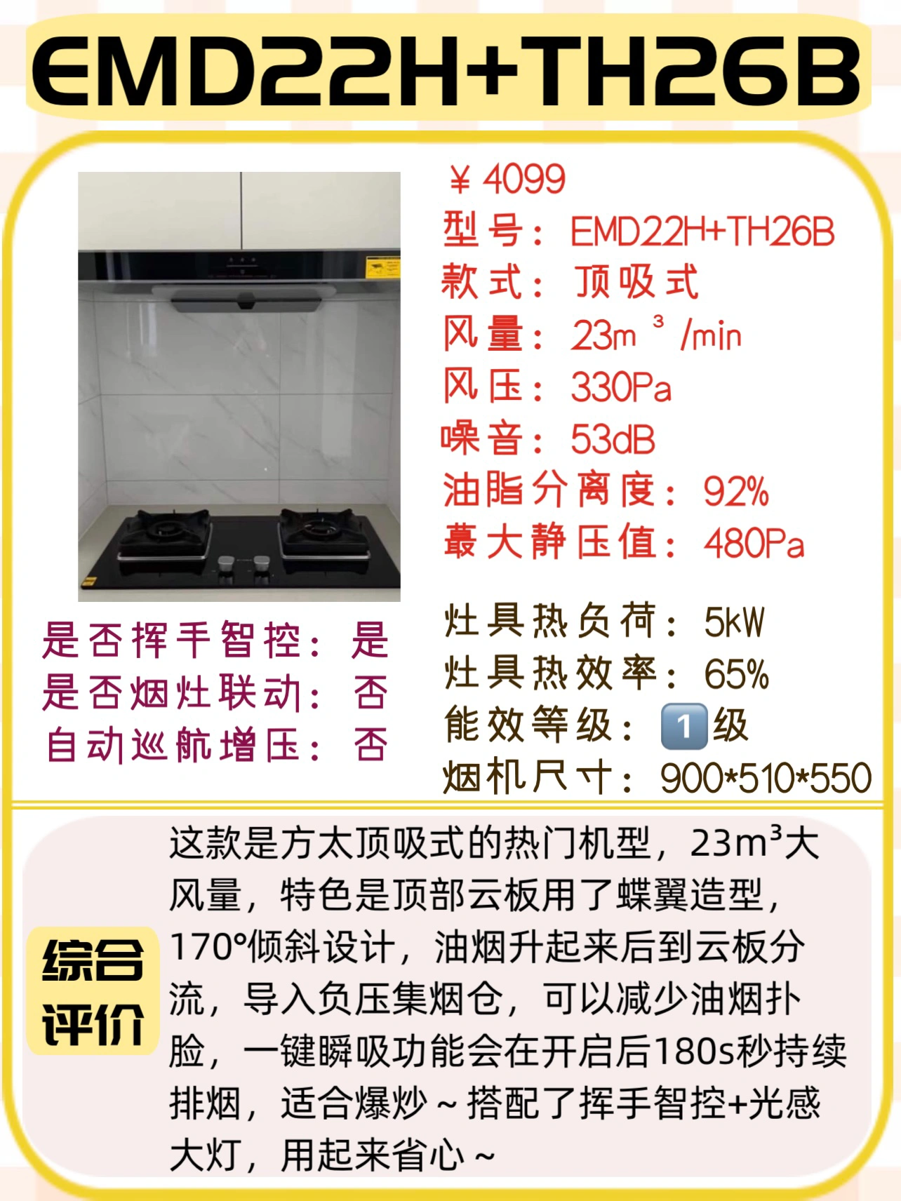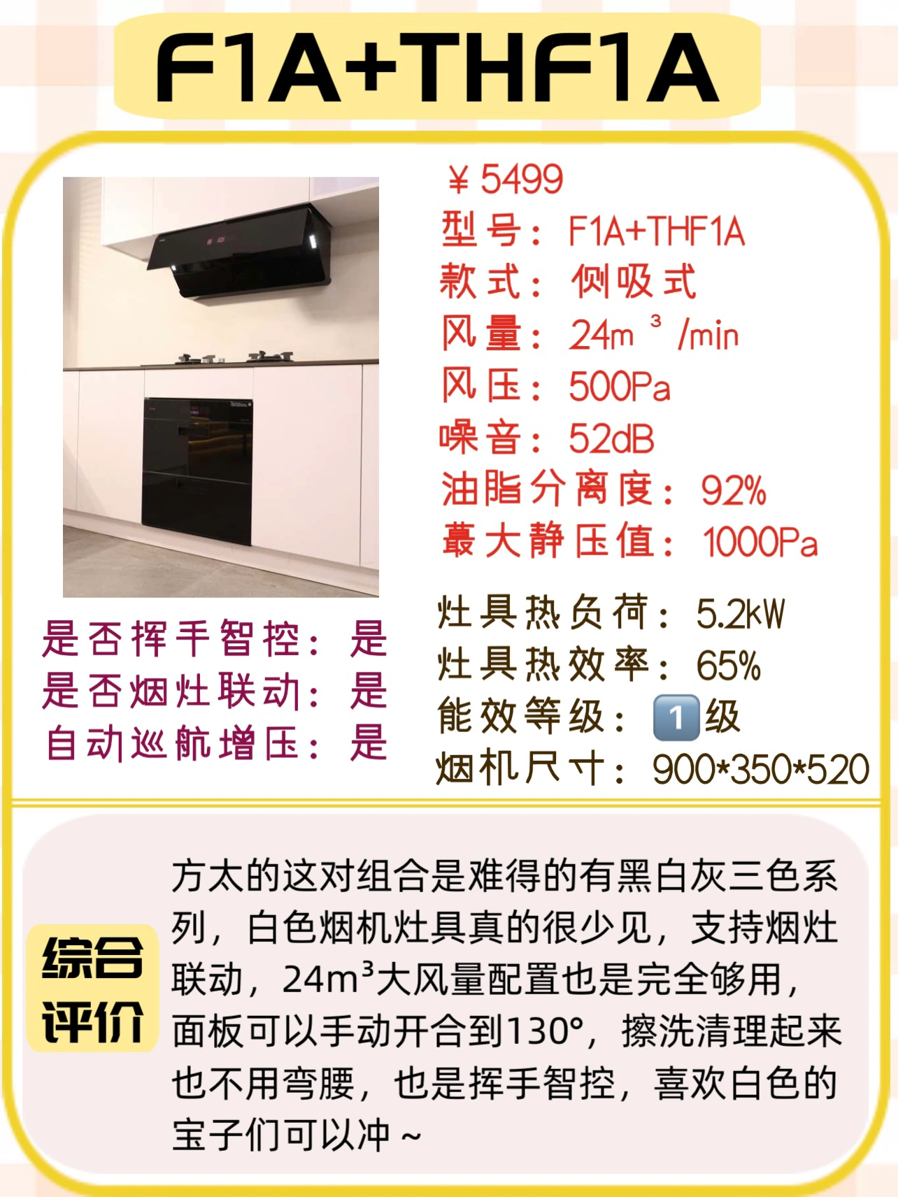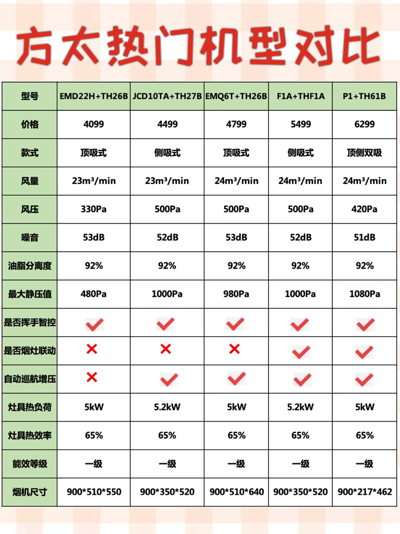 👆👆图6-9,挑了几款方太旗下具有代表性的油烟机+灶具组合,做了参数对比,给宝子们参考,你们在挑选的时候就大概心里有数,核心看哪些参数