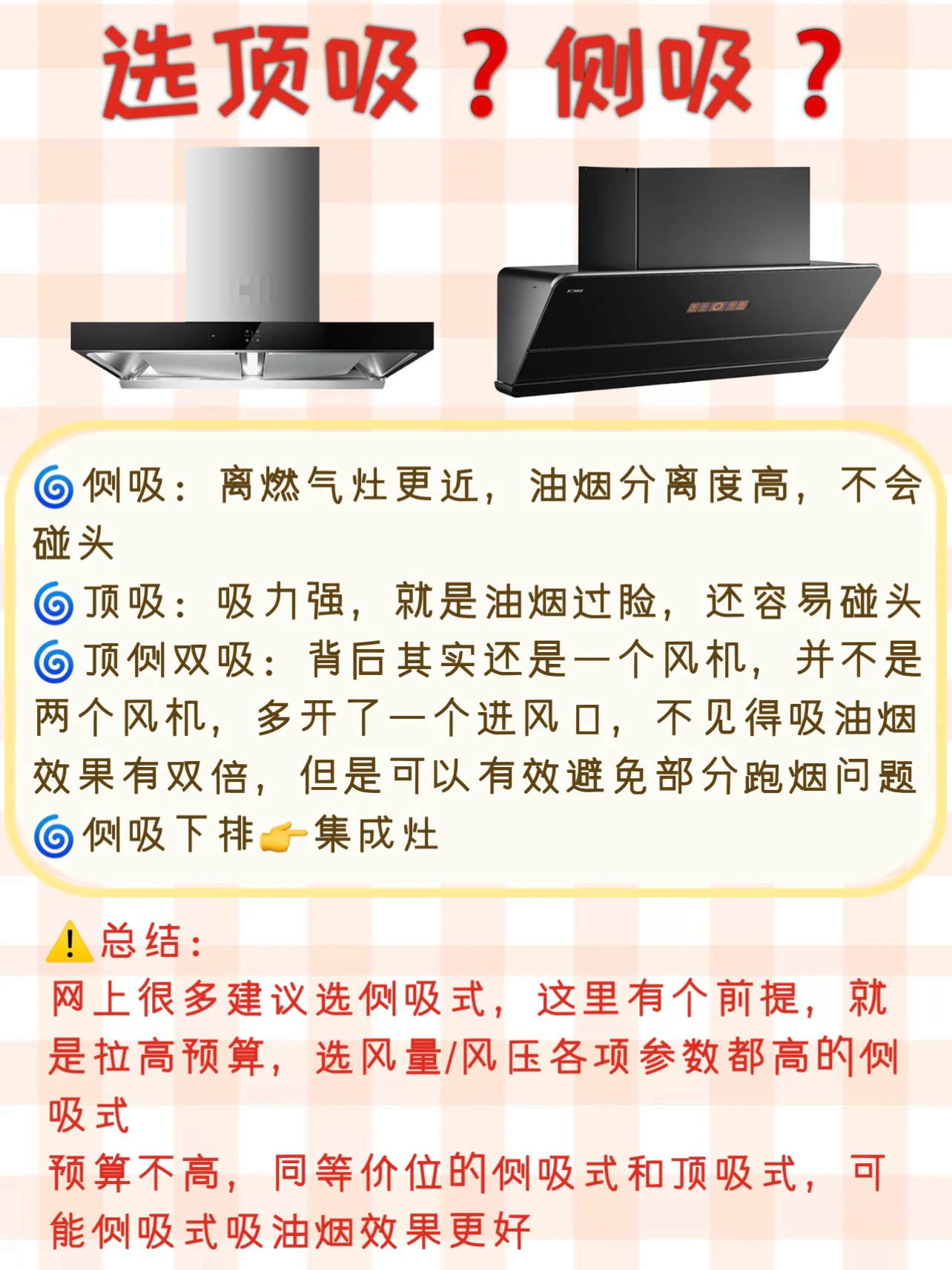 顶吸:也叫欧式,吸力强,就是油烟过脸,还容易碰头