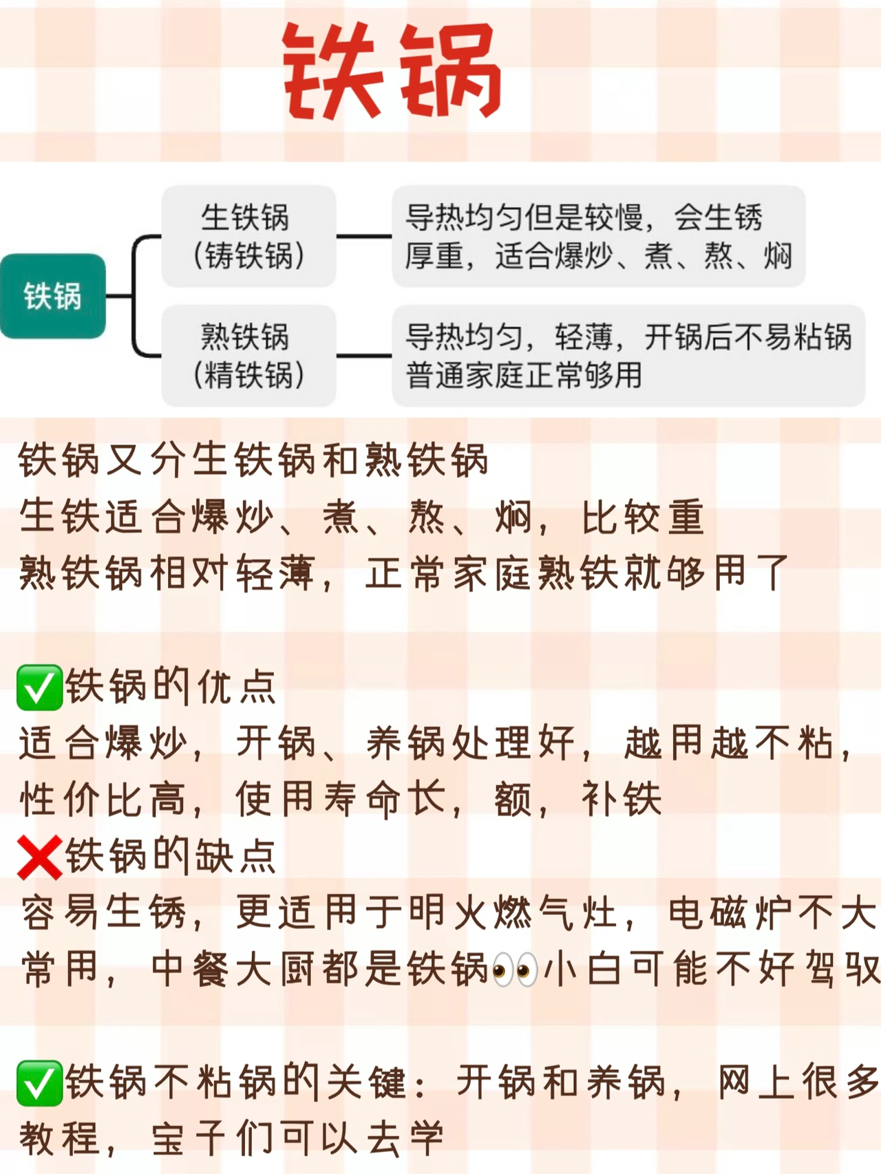 又分生铁锅和熟铁锅,生铁适合爆炒、煮、熬、焖,正常家庭熟铁就够用了
