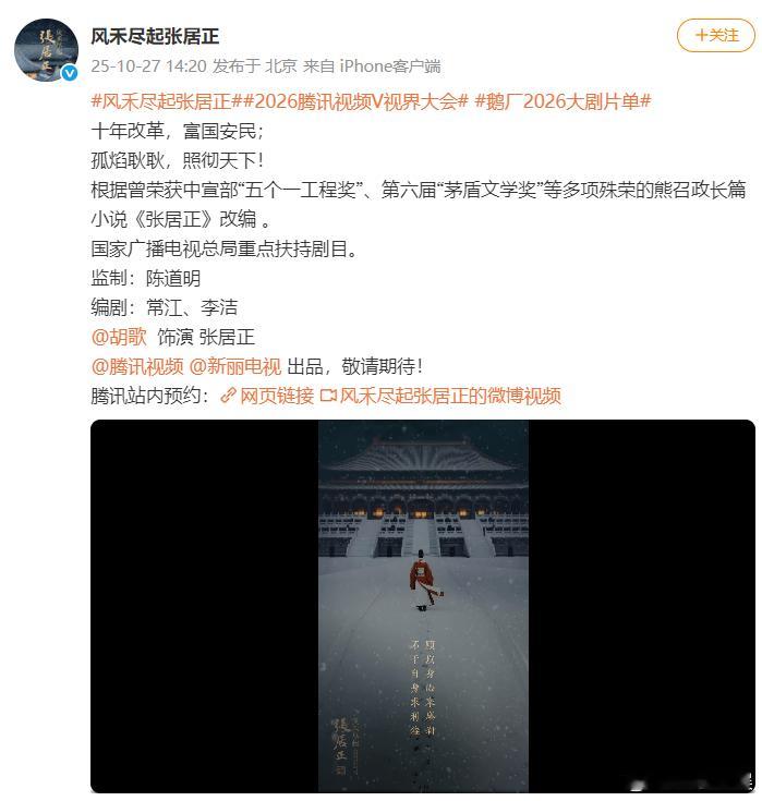 张居正官宣胡歌27日,电视剧官宣饰演张居正,该剧由陈道明监制,常江、李洁