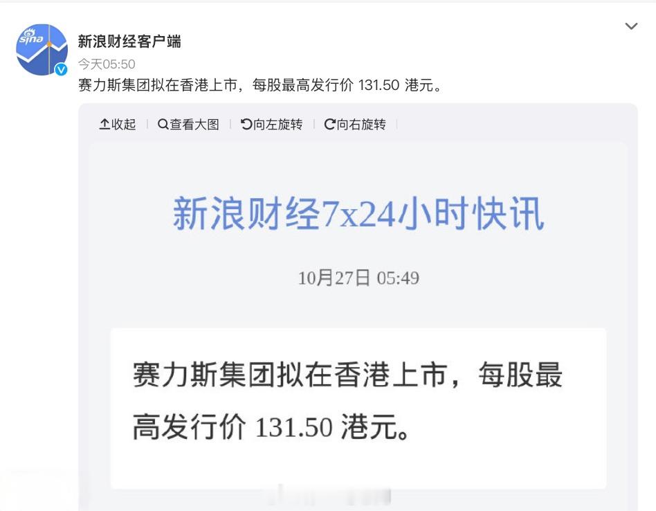 赛力斯 集团拟在香港上市,每股最高发行价为131.50港元,预计11月5日开始交易