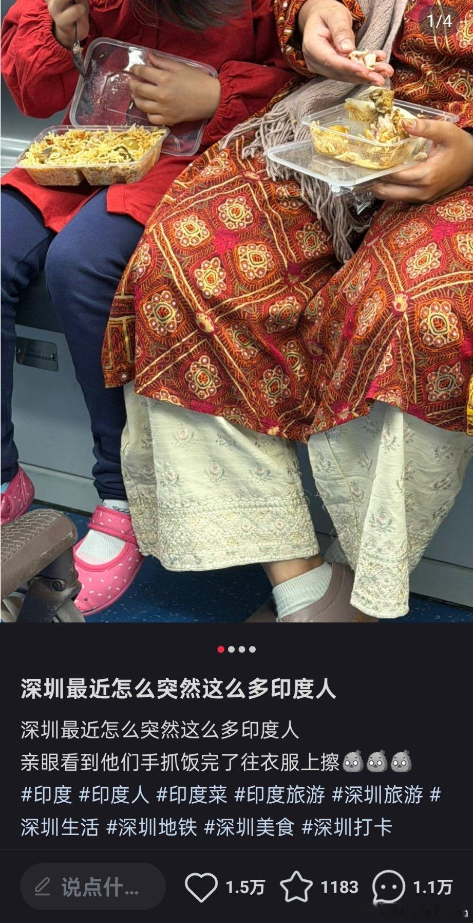 🔻深圳最近怎么突然这么多印度人?有网友发文,有印度人在深圳地铁上吃手抓饭。这也太不卫生了!车厢里不是不能饮食吗?[费解][费解]
