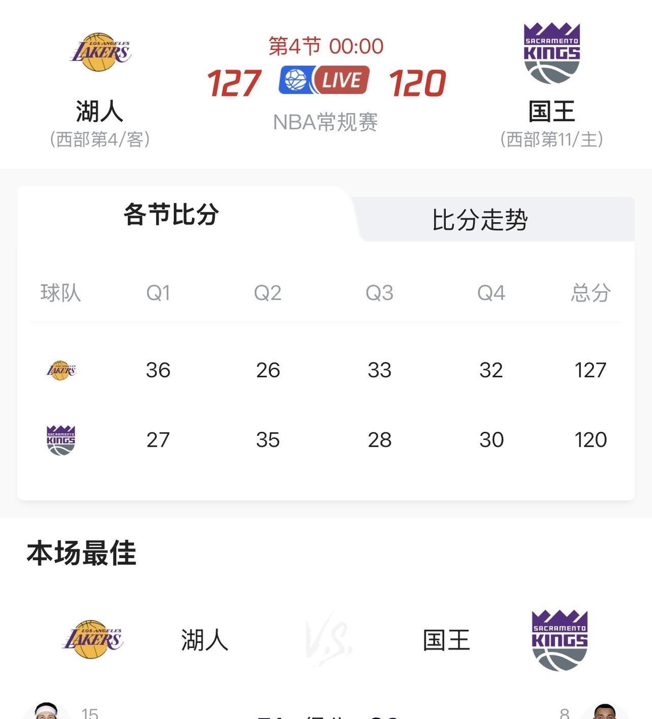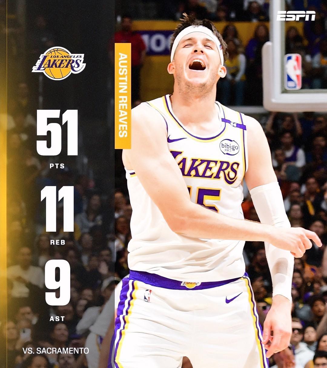2025年10月27日,湖人客场挑战国王,本场比赛东契奇因伤缺阵,里弗斯独自带队,最终湖人以127-120战胜国王,取得两连胜。 里弗斯本场比赛如同天神下凡,出战39分钟,砍下51分,11篮板,9助攻的准三双,NBA历史上第三位在登场四十分钟内就砍下50+11+9的球员。 赢下这场比赛后湖人也取得了两连胜,明天湖人将背靠背迎战开拓者,对于伤病满营的湖人来说明天的比赛能否拿下,让我们拭目以待!#nba# #湖人# #洛杉矶湖人# #湖人里夫斯# #NBA热点#