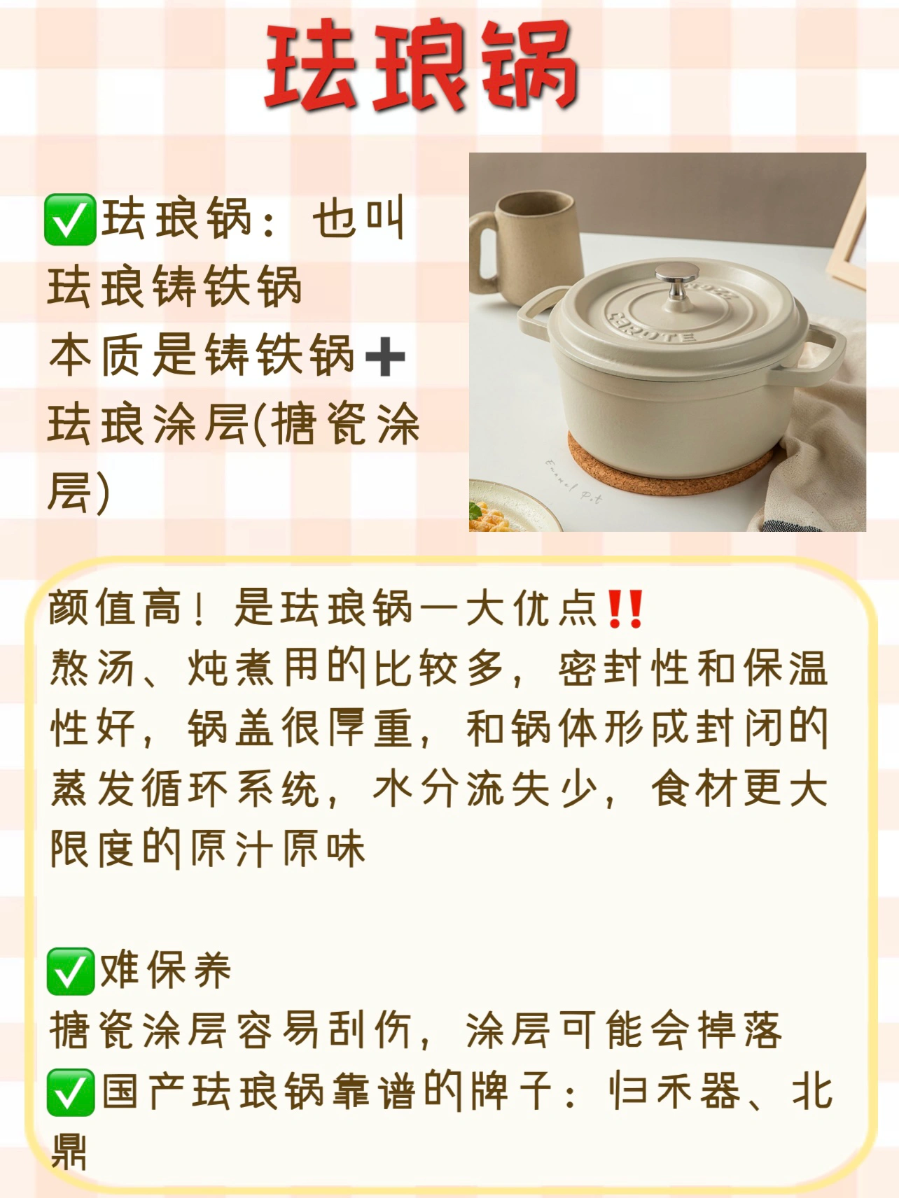 陶瓷不粘锅:这里就要插播现在大火的:珐琅锅,本质是铸铁锅外面加一层搪瓷涂层,更适合煮,爆炒不大合适
