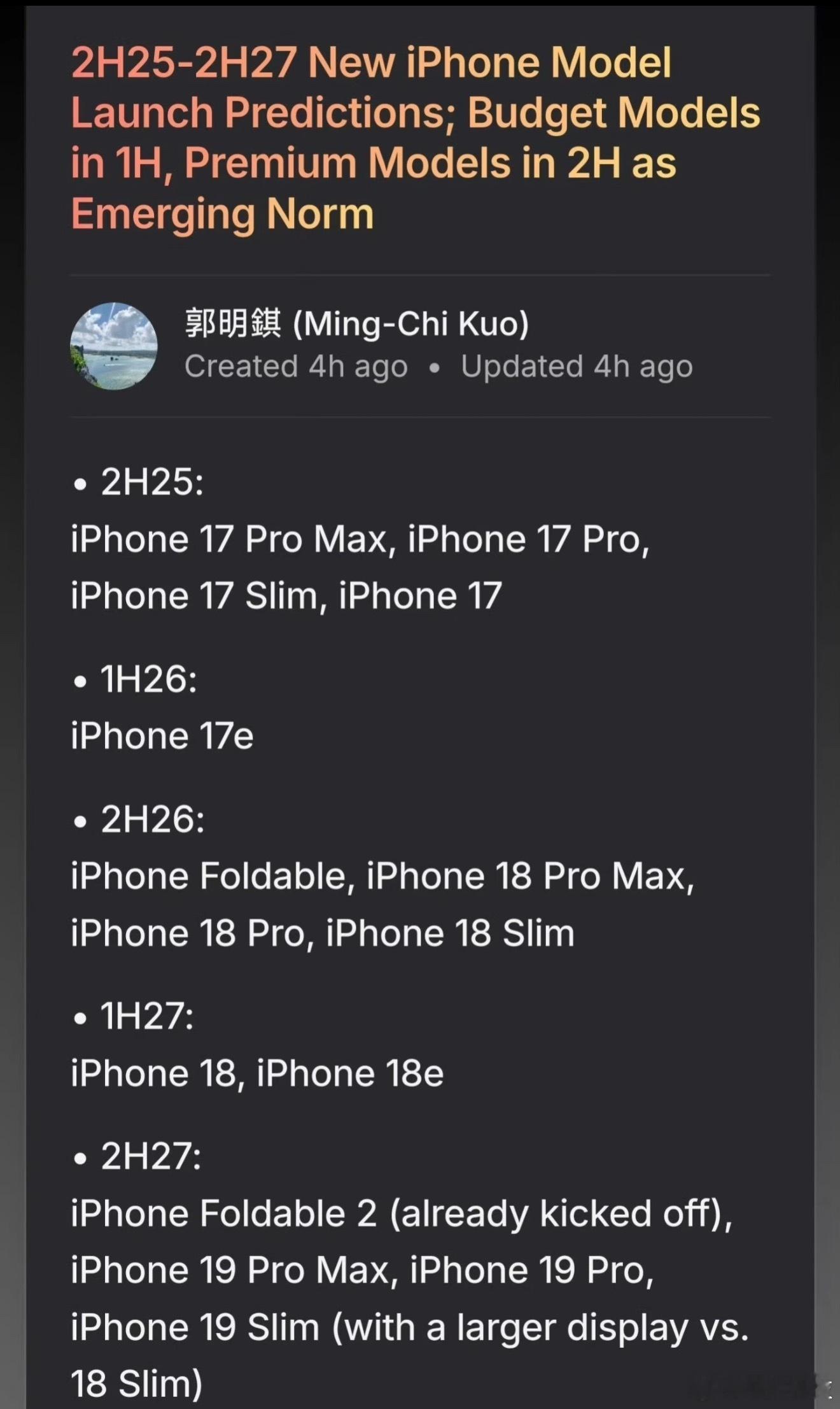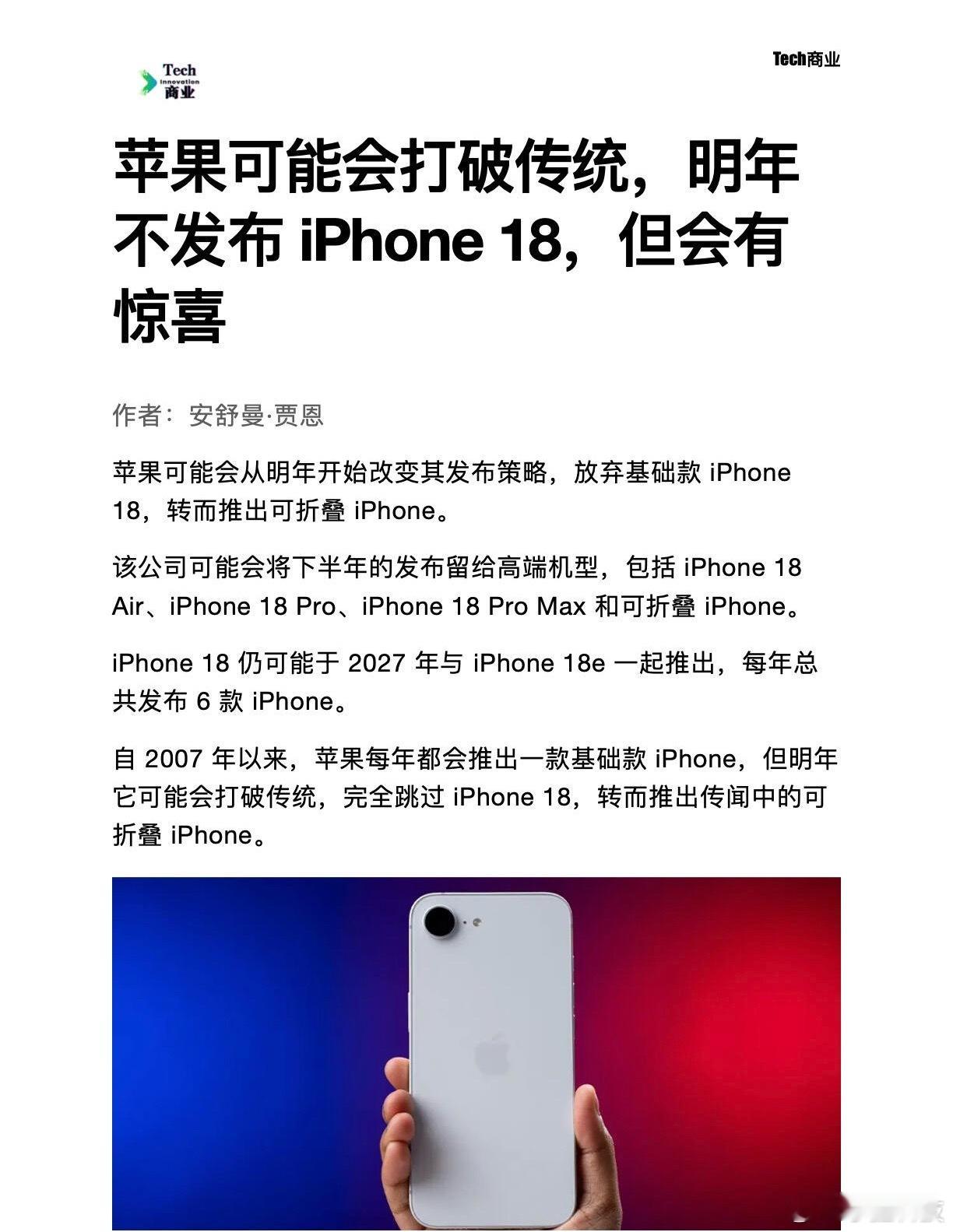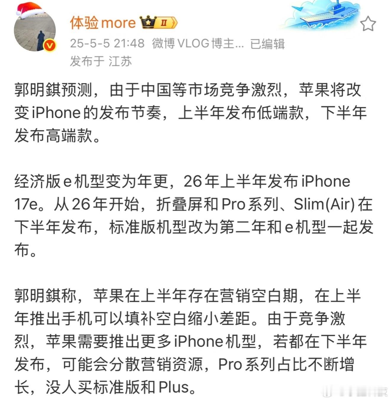 iPhone18发布或推迟发布节奏拆分成上下阶段,以后每年将发布六款iPhone。感觉这样一来数字版和e版的竞争力很弱,毕竟高端型号在前一年秋季发布,半年也该降价了,除了便宜没有其他竞争力的型号。然后同一代的标准版放第二年才发布,那标准版不是更没人买了?