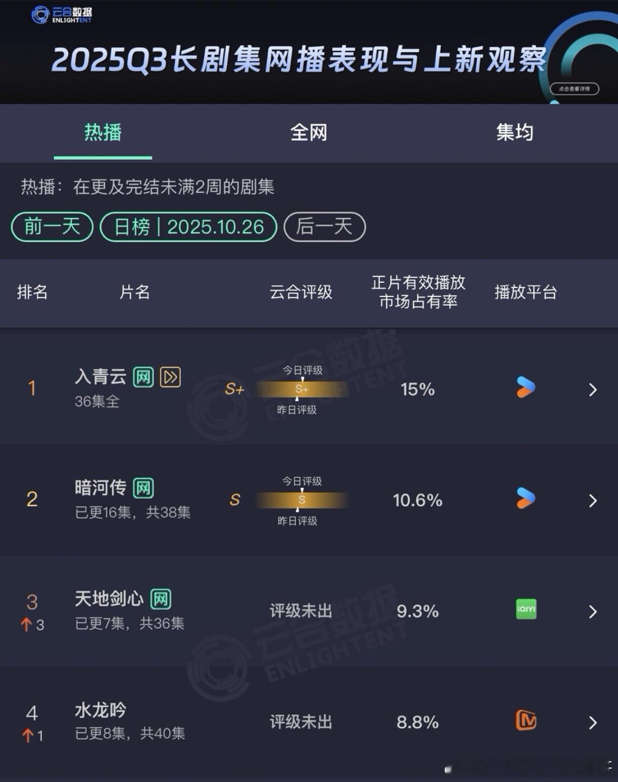 10.26 云合估算播放量入青云, 3496暗河传, 2470天地剑