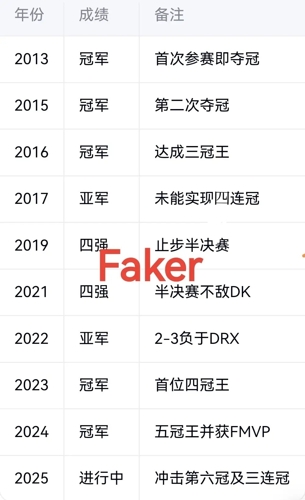 不愧是faker![哈欠][哈欠]2025全球总决赛八强战队中单的S赛历史成绩,Faker五冠王碾压性第一!