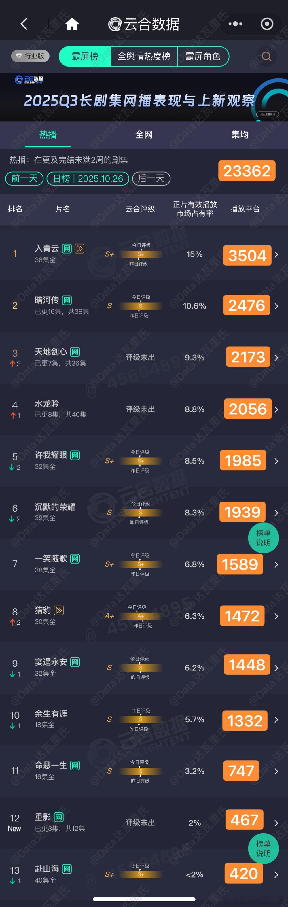 10.26云合估值,粗略估以猫儿为准入青云3504,超点完结暗河传2476,
