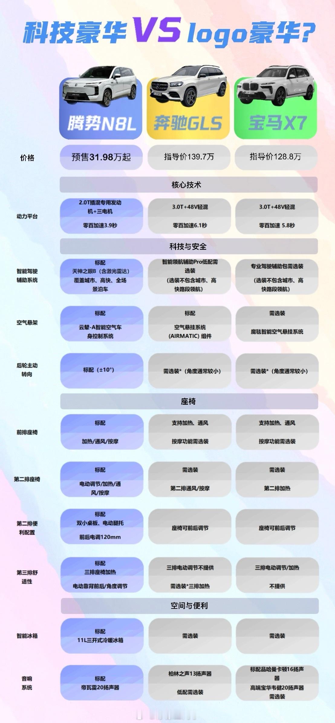 因为在过去,豪华看的是logo;而在今 天,真正的豪华,看的是整车的科技与体验,腾势N8L30万级价格百万级配置