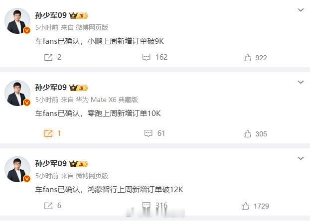 上周新增鸿蒙智行新增1.2万,小鹏9千,零跑破万,理想、蔚来还没有?新能源汽车