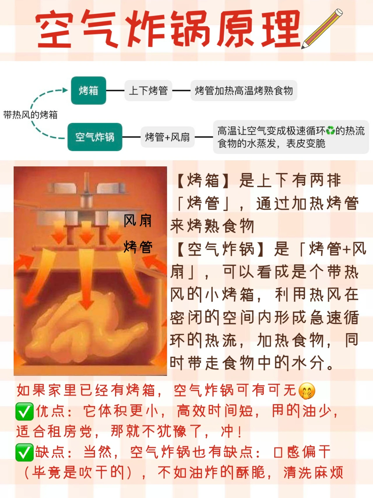 【空气炸锅】是「烤管+风扇」,可以看成是个带热风的小烤箱,利用热风在密闭的空间内形成急速循环的热流,加热食物,同时带走食物中的水分。