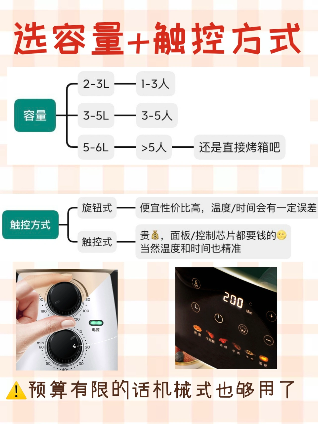 根据人数选择:1-2人,建议选择2-3L容量;3-5人,建议选择3-5L;大于5个人,建议选择6L+,可以考虑直接买烤箱了