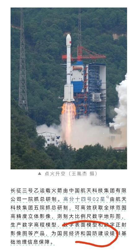 军事用途,终于大大方方地说出来了,一切敌人颤抖吧。 10月26日,长征三号乙运载火箭托举着高分十四号02星直冲云霄,这颗由航天科技集团五院研制的高清晰立体影像测绘卫星,不仅创下了长征系列运载火箭第603次飞行的新纪录,更用一句“为国民经济和国防建设提供基础地理信息保障”,打破了几十年来航天发射通报的表述惯例。 放在以前,不管是2013年发射的高分一号,还是后续的系列卫星,官方介绍永远绕不开国土资源调查、农业估产、防灾减灾这些“民生活儿”,就算外媒早就揣测我国高分辨率卫星具备军事价值,能轻松识别飞机坦克,我们也从不在公开通报里直白点破。 这次“国防建设”四个字明晃晃地出现,没有任何模糊空间,就是大大方方地告诉所有对手,这颗卫星的军事用途,我们认了,也底气十足地亮出来了。 高分十四号02星的硬实力,才是这份直白的最大底气。 它能高效获取全球范围的高精度立体影像,测制的大比例尺数字地形图可不是手机导航那种粗略版本,而是能精准呈现地形起伏、道路细节、建筑结构的军用级产品,生产出的数字高程模型、数字表面模型更是能把地表情况三维还原。 要知道,早在2013年的高分一号就已经实现了2米分辨率全色成像,作为后续升级型号的高分十四号02星,分辨率只会更高,大概率达到亚米级水准,也就是说地面上不到1米的物体都能被清晰捕捉。 这种精度意味着什么?战场上的坦克部署、战机停放、舰船动向,甚至是隐蔽工事的入口、桥梁的承重结构、道路的坡度曲率,都能被它看得一清二楚,而这些数据正是精准打击、部队机动、阵地布设的核心依据。 以前我们说卫星服务于地理测绘,没人会否认,但现在直接把“国防建设”的用途点透,本质上是技术实力已经不需要再“藏着掖着”,好东西就是要让该看见的人看见。 回顾高分系列卫星的发展历程,军事潜力早有迹可循。 高分一号在轨测试期间,就曾为甘肃岷县地震、四川雅安地震提供近400景灾后观测数据,快速勾勒出灾区地形地貌和损毁情况,这种快速响应、精准成像的能力,放到军事场景中就是战场态势感知的关键支撑。 外媒早有判断,我国高分辨率卫星能显著增强精确打击能力,甚至可以反制隐身武器,因为不管武器如何隐身,其依托的地形环境、部署的场地设施都无法隐身,而高分卫星提供的高精度地理信息,能让制导武器像有了“地形导航图”,即便没有卫星信号指引,也能通过地形匹配实现精准命中。 高分十四号02星的全球观测能力更让这种优势升级,不管是远海的舰船活动,还是内陆的军事演习,不管是高原的阵地构建,还是海岸的防御部署,它都能实现全覆盖、高精度监测,让任何试图隐藏的军事行动都无所遁形。 现在敢直白提国防用途,更是国家实力和战略自信的体现。 以前我们的航天事业处于追赶阶段,高分专项作为国家重大科技专项,首要任务是解决高分辨率遥感数据的国产化问题,替代国外进口数据,先满足国民经济的迫切需求。 随着长征火箭发射次数突破600次,高分系列卫星形成体系化布局,我们的空间信息产业已经从“跟跑”变成“并跑”甚至“领跑”,不再需要通过模糊表述来避免不必要的争议。 就像珠海航展上歼-20、运-20等高端装备公开亮相一样,航天领域的直白表述也是一种开放自信的展示——我们的国防建设不需要遮遮掩掩,我们的航天技术既能服务于“一带一路”建设、农业生产这些民生领域,也能稳稳扛起国防保障的重任。 这种自信不是凭空而来,是高分一号到高分十四号02星的技术迭代积累,是航天人几十年的自主创新,更是国家综合实力的硬支撑。 那些心怀不轨的敌人确实该好好琢磨这句话的分量了。 以前他们或许还能心存侥幸,觉得可以通过隐蔽部署、伪装设施来规避监测,但高分十四号02星的出现,加上官方毫不避讳的用途说明,相当于直接告诉他们:你们的一举一动,都在我们的“太空眼睛”注视之下;你们依赖的地形优势,我们已经通过高精度测绘了如指掌;任何针对我国的军事挑衅,都将面临精准高效的反制。 这不是口头上的威慑,是有实打实的技术和数据做支撑,是几十年来航天事业厚积薄发的必然结果。 当一颗卫星能把全球的地形地貌精准还原,能为国防建设提供全方位的地理信息保障,还能被官方大大方方地公开用途,这种威慑力远比千言万语更有力量,也难怪会让所有敌人为之颤抖。