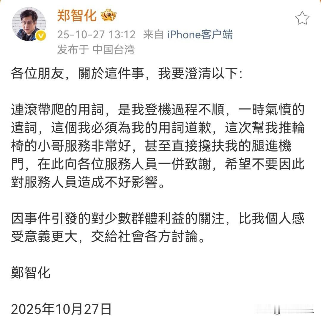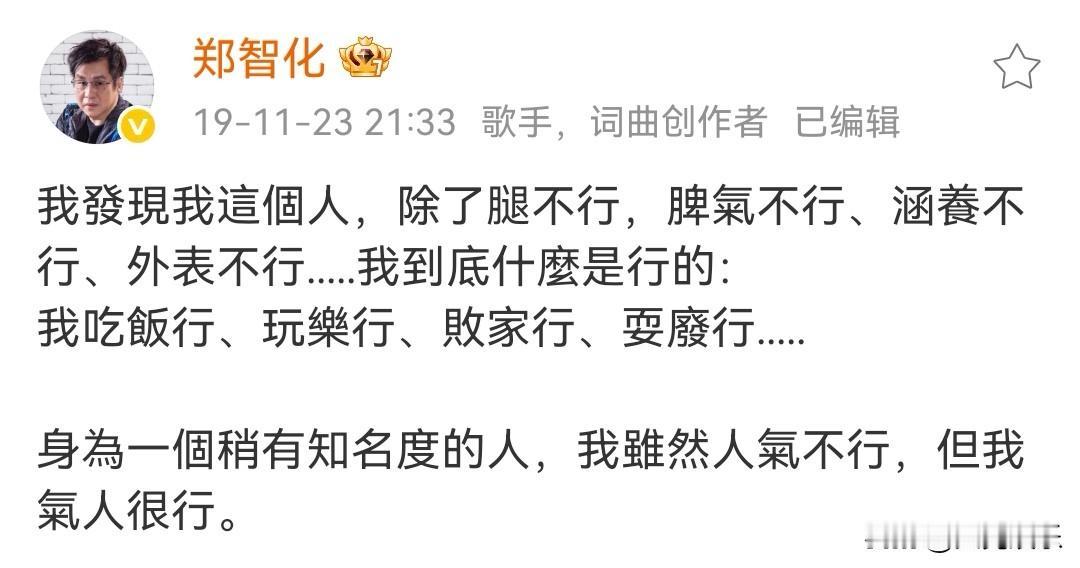 看一下郑智化六年前发的微博,结合他最近的事情,就能得出一个结论:郑智化脾气不好,爱发牢骚。 郑智化当年说自己除了腿不行,脾气也不行,甚至还缺少涵养,他还调侃自己败家,只知道吃喝玩乐。 郑智化还说自己虽然人气不行,但气人很行,通过他在深圳机场的遭遇来看,他确实是在生气的前提下,才说了那些不负责任的话。 10月27日,郑智化道歉了,整件事情也告一段落了,但作为公众人物,说的每一句话都有可能引发关注,希望郑智化老师以后少发脾气,谨言慎行。