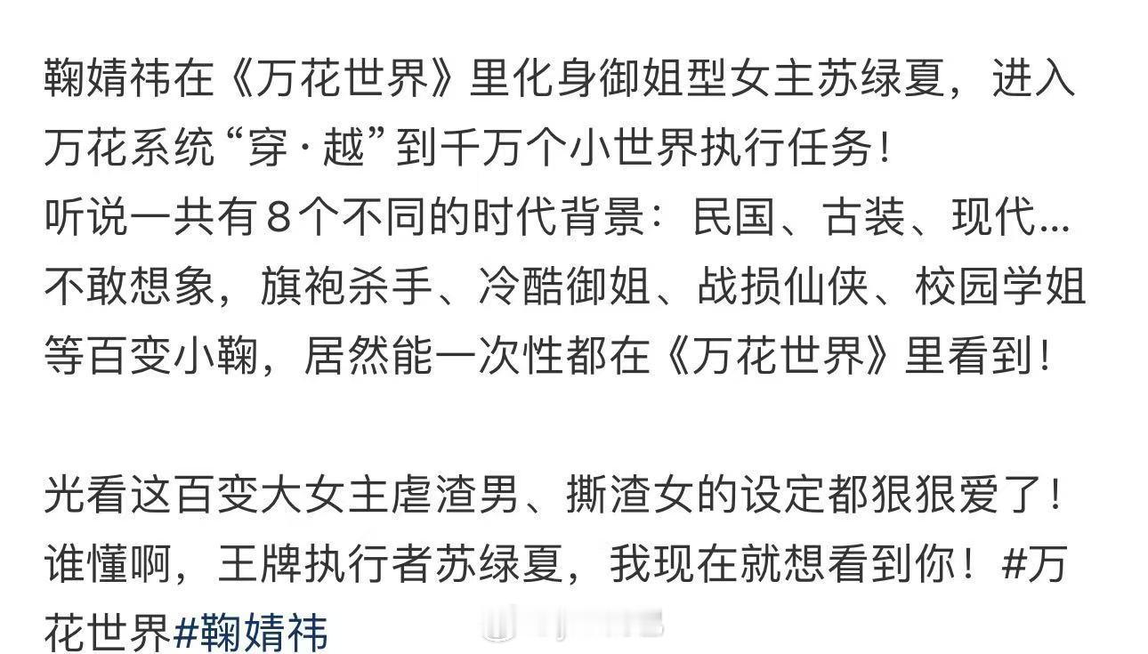 鞠婧祎《万花世界》是快穿逆袭剧,hxyl在系统风创新上面还是有点东西的[吃瓜]看