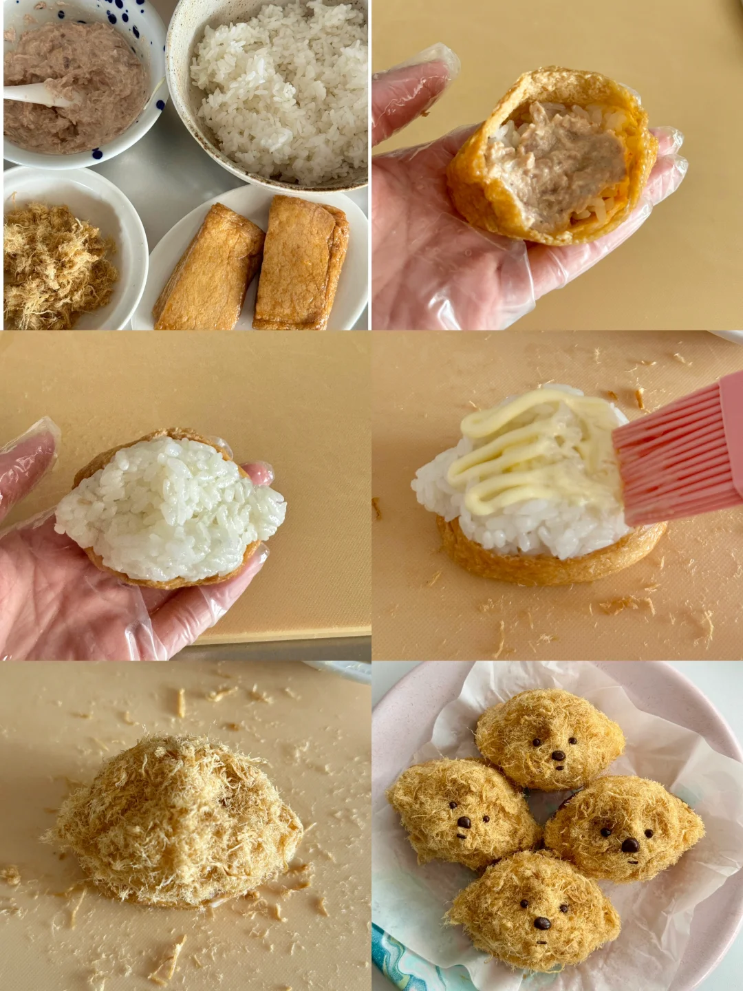 1️⃣将米饭先打一层底在豆腐皮里,中间加上吞拿鱼沙拉,再用米饭捏出小狗的造型放在顶上