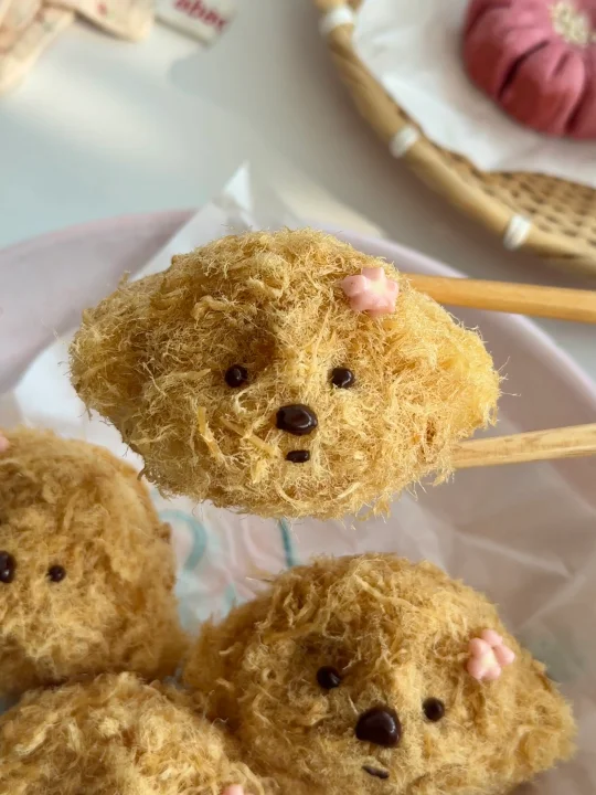 2️⃣米饭表面刷上沙拉酱,铺一层肉松,用黑巧克力酱画出眼睛和鼻子,用白、粉巧克力酱画出小花花