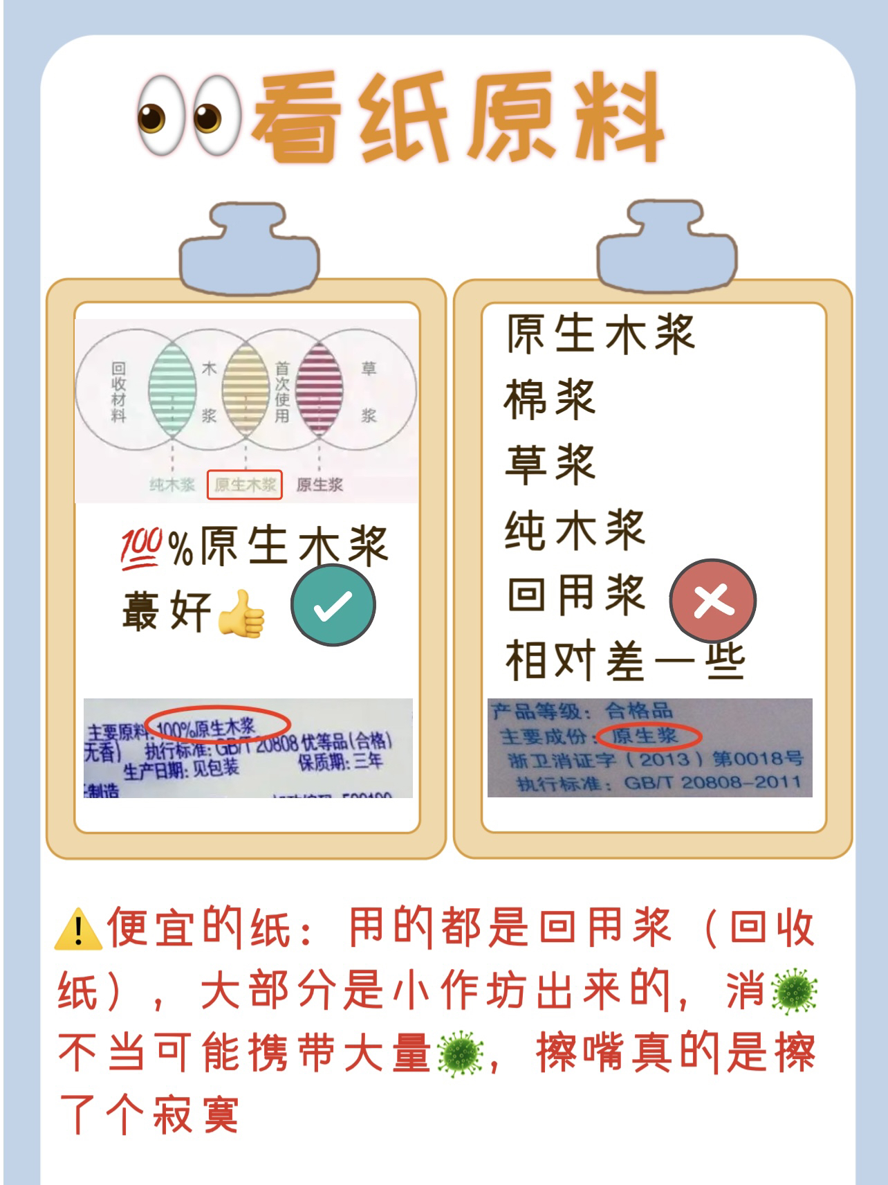 ⚠️便宜的纸:用的都是回用浆(回收纸),大部分是小作坊出来的,消🦠不当可能携带大量🦠,擦嘴真的是擦了个寂寞,如果再用回收纸制造,那质量可想而知了
