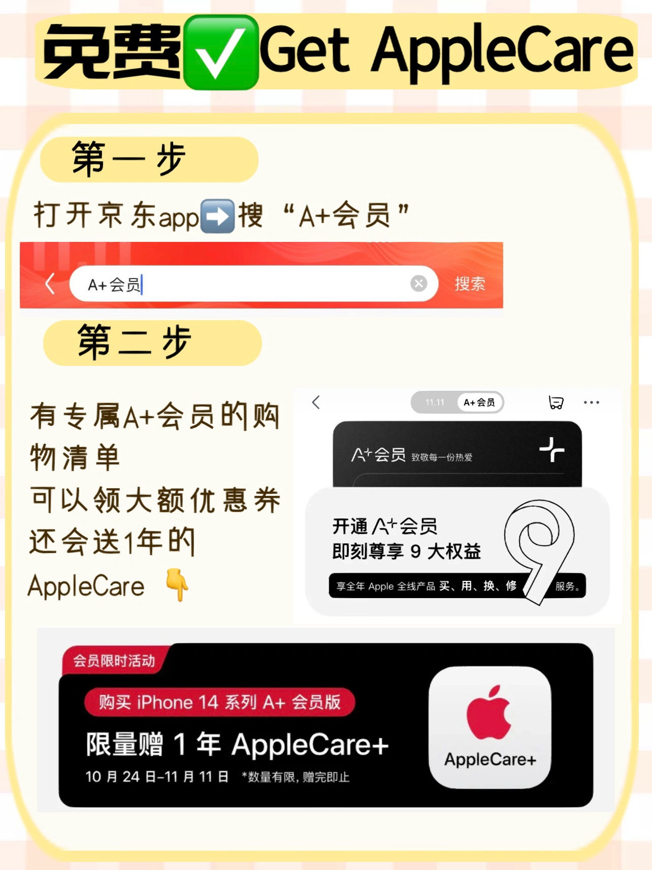 除了价💰格优惠,东的A+会员购买14系列还可以额外赠1年的applecare+