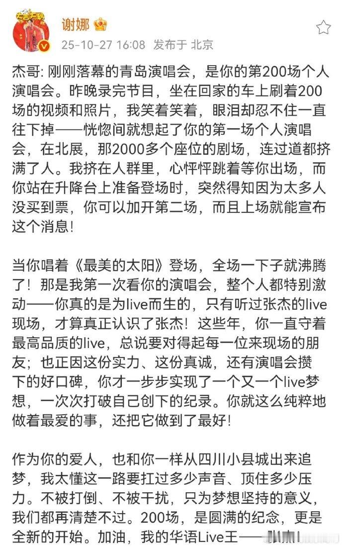谢娜说张杰为live而生 谢娜说张杰为 live 而生,200 场演唱会藏着多少个练歌到深夜的日子,娜姐的陪伴太戳,下一场 live 必须冲,就等《这就是爱》现场!谢娜发文庆祝张杰第200场演唱会谢娜加油我的华语live王张杰
