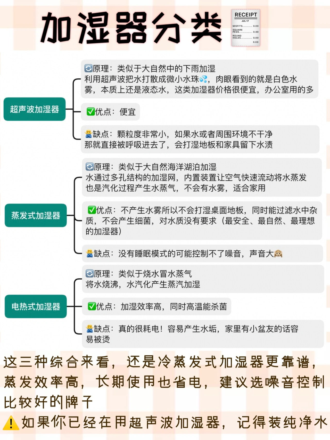 主要分:超声波加湿器/冷蒸发加湿器/电热式加湿器三种,冷蒸发式加湿器更靠谱,具体区别看图3⃣️⬆️