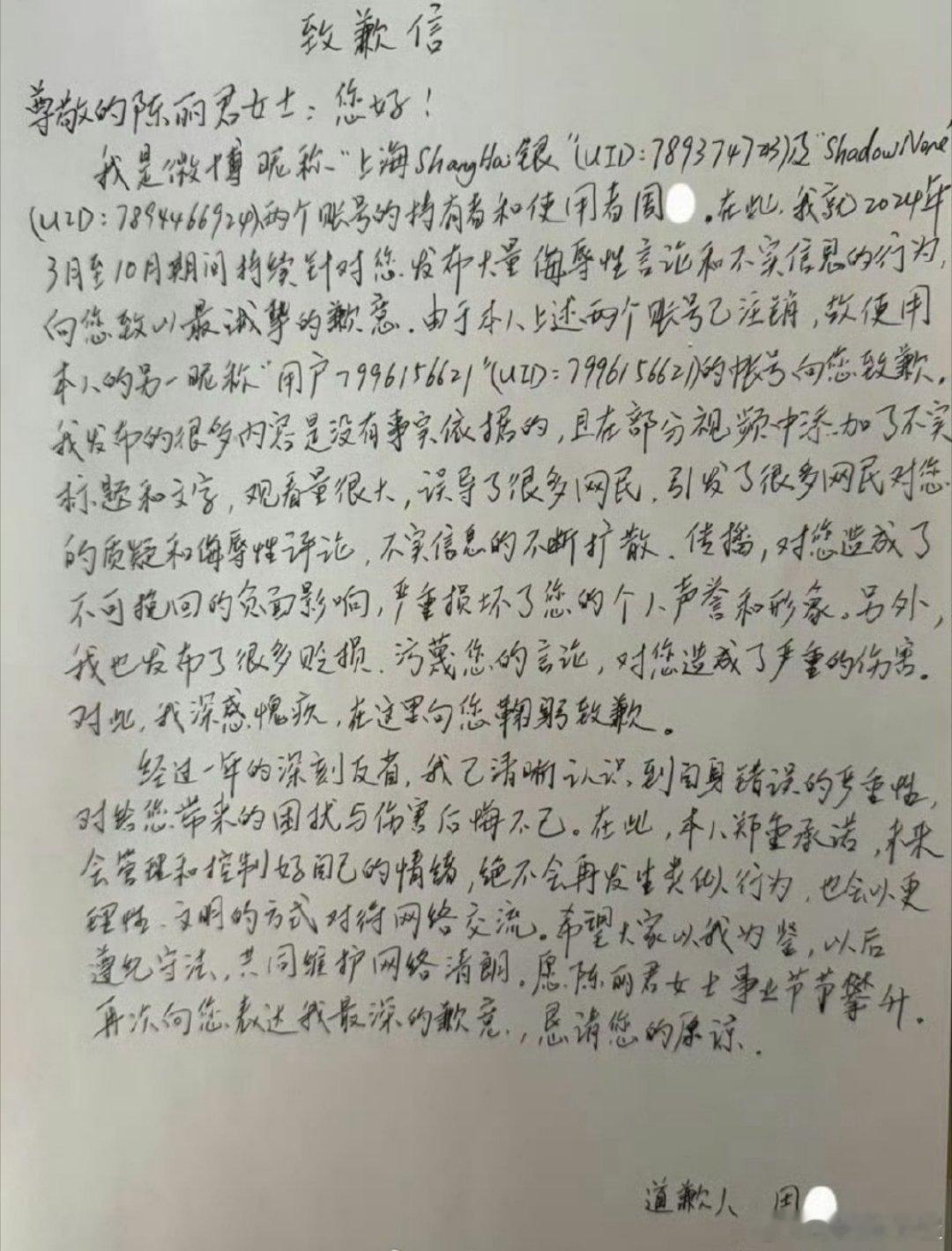 嘿粉向陈丽君公开视频致歉及手写道歉信道歉