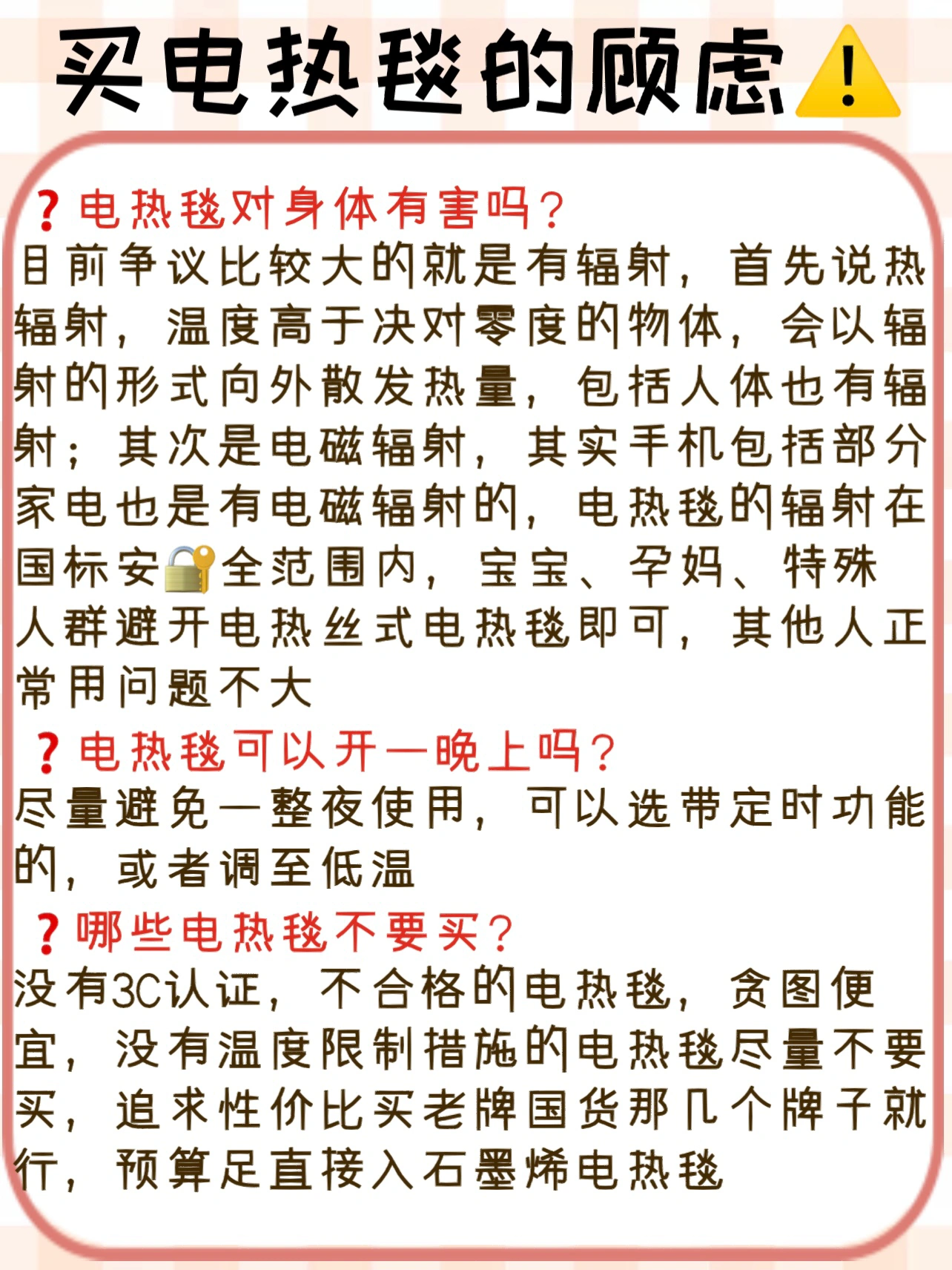 目前争议比较大的就是有辐射,首先说热辐射,温度高于决对零度的物体,会以辐射的形式向外散发热量,包括人体也有辐射;其次是电磁辐射,其实手机包括部分家电也是有电磁辐射的,电热毯的辐射在国标安🔐全范围内,宝宝、孕妈、特殊人群避开电热丝式电热毯即可,其他人正常用问题不大