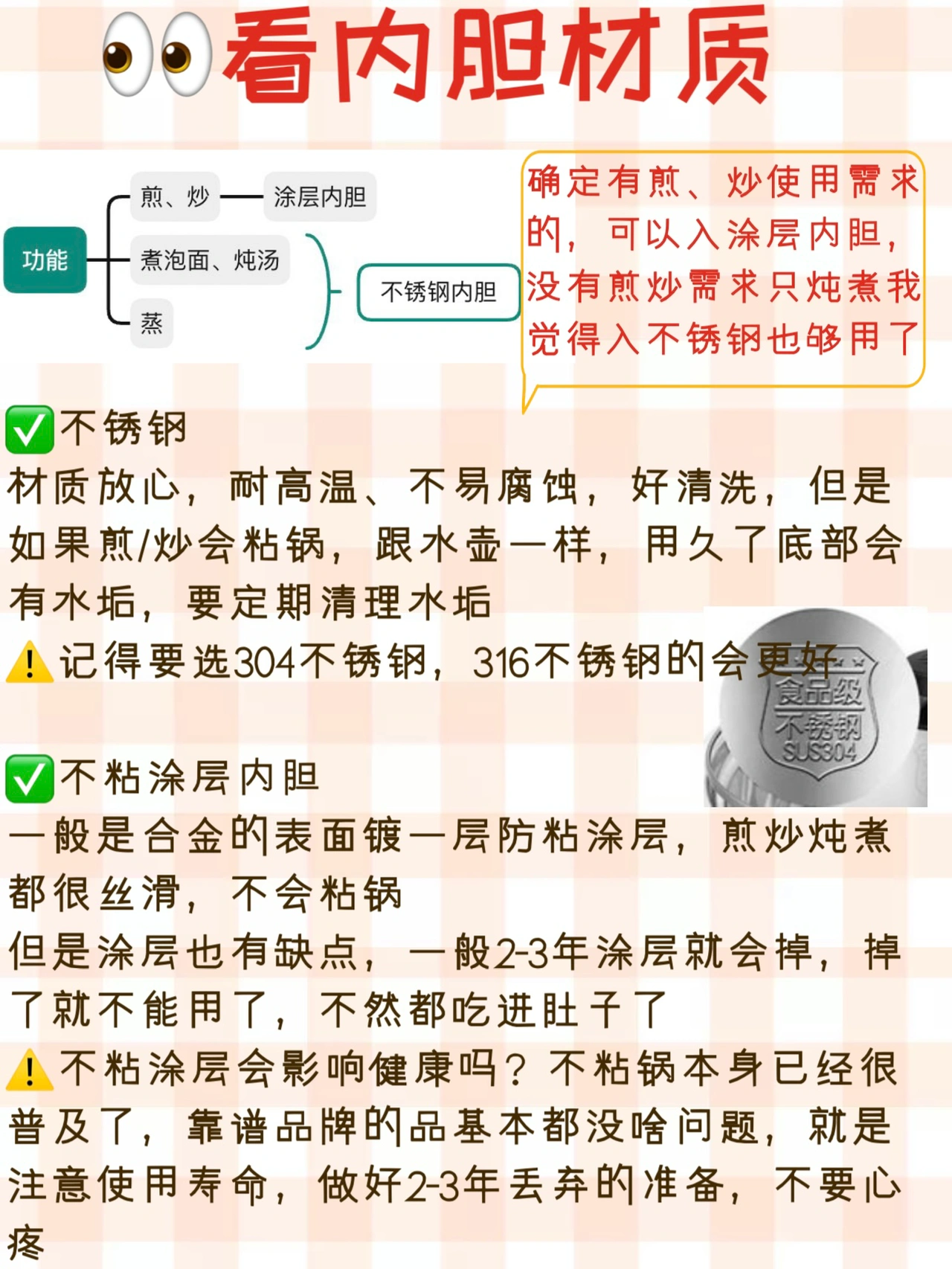 确定有煎、炒使用需求的,可以入涂层内胆,如果没有煎炒需求只炖煮我觉得入不锈钢也够用了