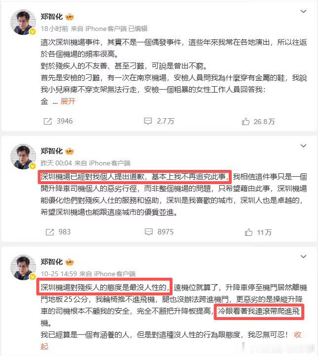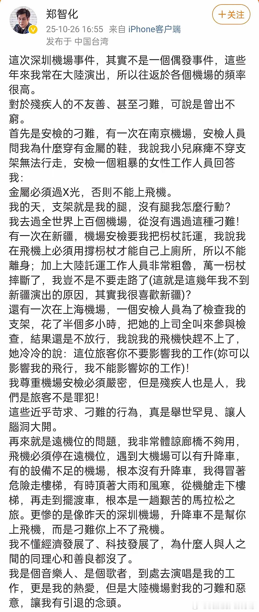 10月25日,郑智化发文怒斥深圳机场态度没人性,升降机司机操作不当,“冷眼看他连滚带爬”进飞机……随后,深圳机场放出了视频,大家没有看到什么连滚带爬,反而是工作人员一路扶着郑智化上了飞机。一个扶着他的拐杖,一个稳住轮椅,机舱里还有人伸手接应。