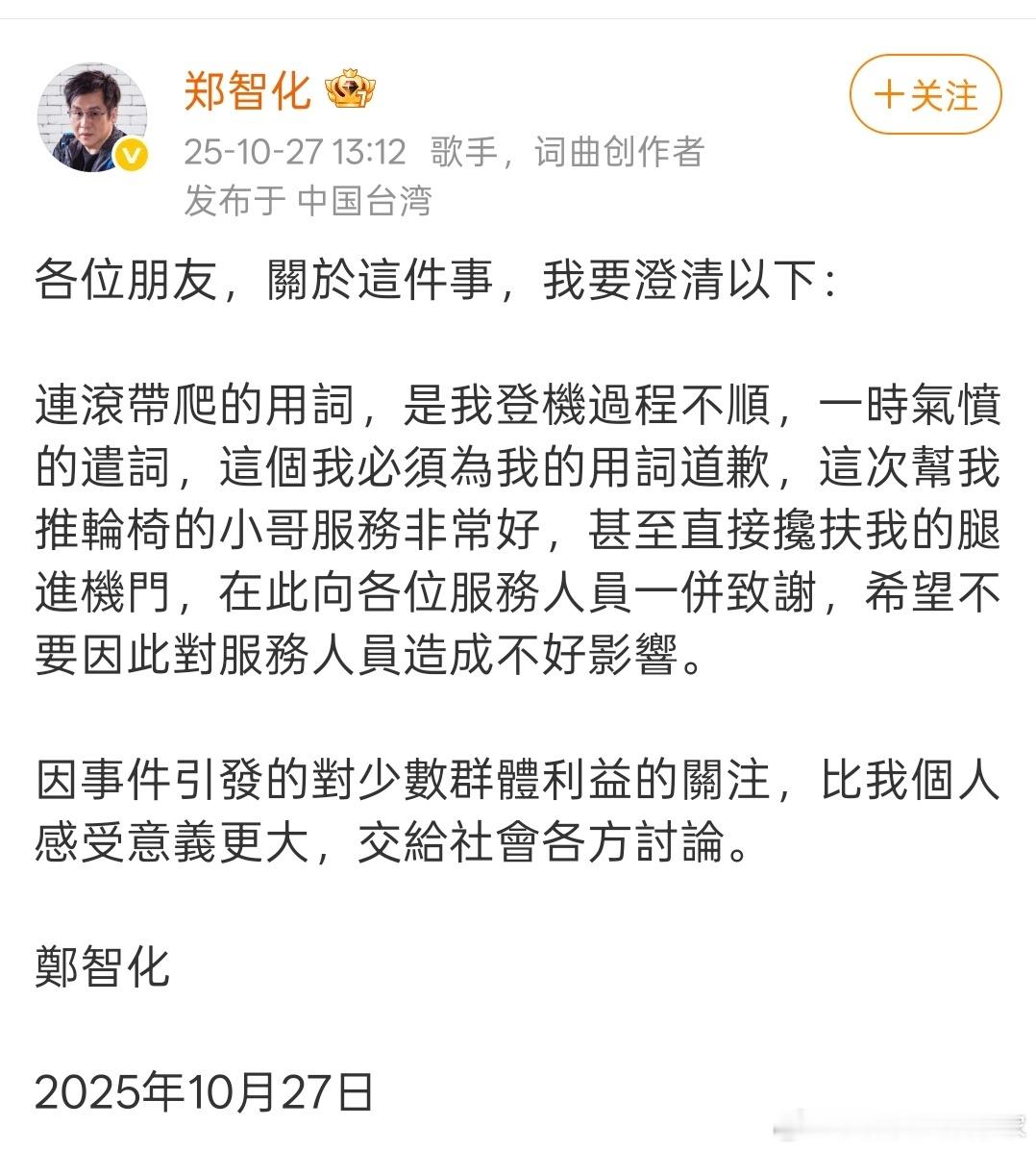 郑智化发文为自己的夸大言辞道歉,表示“连滚带爬”是一时气愤的用词。10月25日,