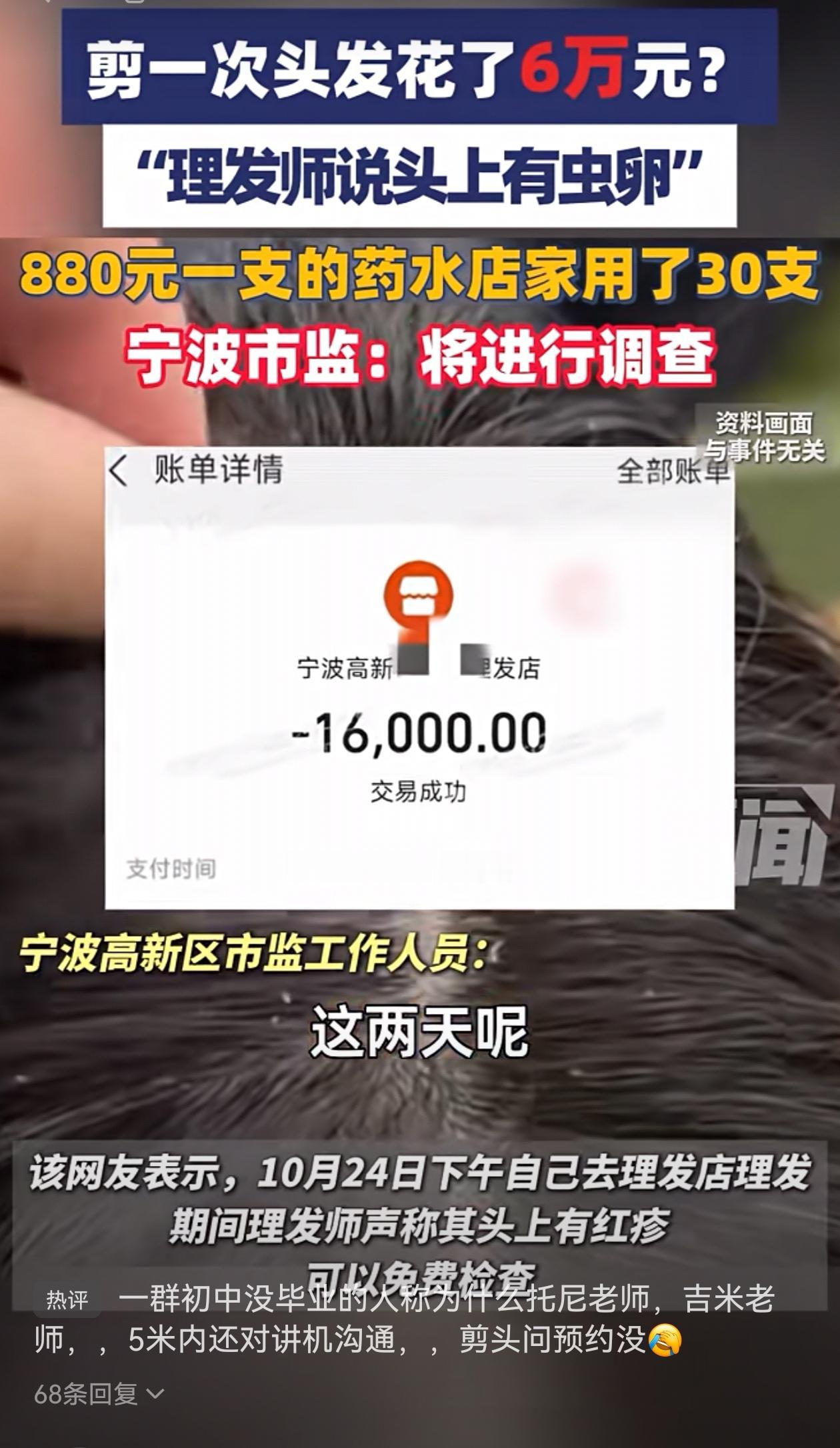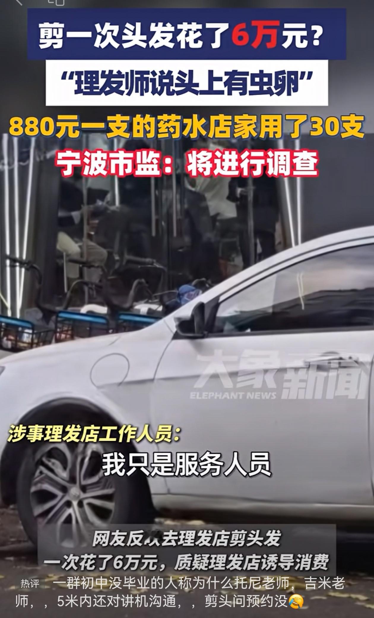 怎么敢开口?理一次发花了6万?有位男士到浙江宁波一家理发店理发,理发师先跟他头上有红疹,说免费检查,检查完了说头上有虫卵。接着用了880一支的药水去虫卵,一口气用了30支,2.6万! 这还没完,转头又被忽悠办了个6万的套餐,后续去虫卵费可以扣卡上的钱! 简单理个发,就遇到红疹了、还遇到虫卵了!理发店客串了医院的活儿,收的可是医院都不敢要的天价费啊! 男士觉得自己太亏,到市监局举报。市监局一查,果然,未明码标价、虚假宣传、强制消费,三项违规!停业整顿加罚款十万,还得把骗的钱全退回去,真是大快人心! 罚得好!咱普通人理个发,几十上百块顶天了,谁理得起这种天价发啊? 信息来源:大象新闻