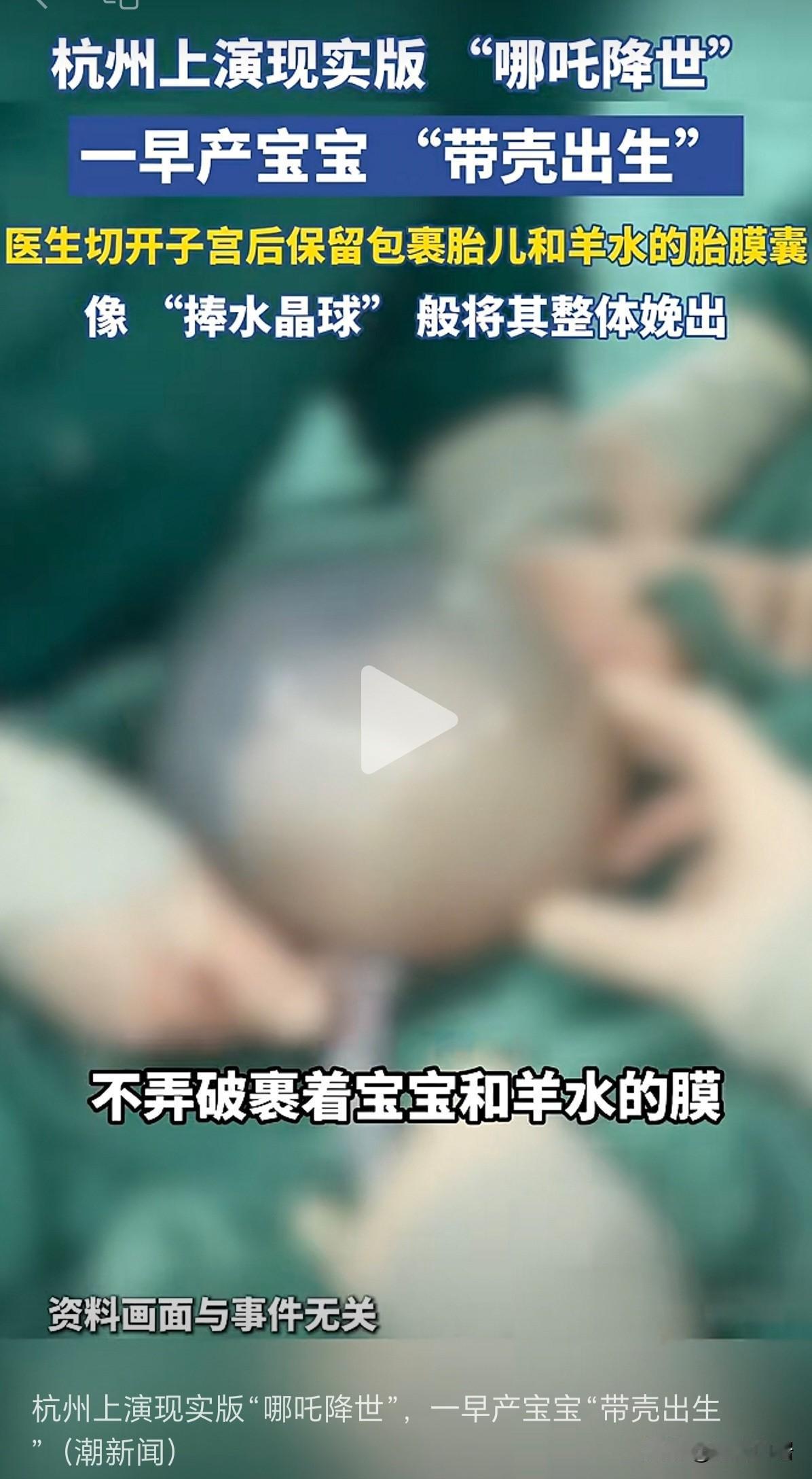 杭州一医院,上演现实版“哪吒降世”,一早产宝宝通过剖腹产,带壳出生。由于该宝宝的母亲,在怀孕32周时,血压升高,母婴危急。于是医院团队决定通过手术,保留包裹胎儿和羊水的胎囊膜,将其整体取出。 最终手术进行的很顺利,整个过程中没有弄破包裹宝宝和羊水的膜,而是像捧水晶球一样,将宝宝和羊水以及膜,整体取了出来。 然后再轻轻的拆开这层膜,1640克的早产宝宝也顺利降生,女子平安。当啼哭声响彻手术室时,在场所有医护人员都松了一口气。 来源:潮新闻