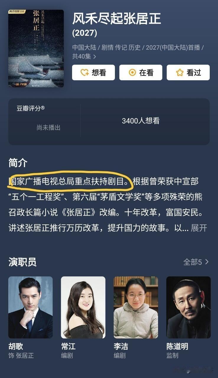 好消息!老胡终于杀回来了 刚看到消息直接激动了—— 胡歌确认演《风禾尽起张居正》 里的张居正了! 这可是明代传奇首辅啊! 谁没追过他的剧? 从《仙剑》里跳脱的李逍遥, 到《琅琊榜》里隐忍的梅长苏, 再到《繁花》里大气的宝总, 每个角色都让人印象深刻💙 现在44岁的他, 正好到了有阅历的年纪, 沉稳气场跟张居正的智慧权谋太搭了!而且这剧不一般, 改编自茅盾文学奖作品, 还是广电重点扶持的历史正剧, 陈道明监制,规格配置拉满! 就盼着胡歌把这位改革家演活! 也希望通过这剧, 让更多人看到中生代演员的实力, 好演员的春天哪能被年龄卡着? 坐等播出,我先搬好小板凳了! 胡歌 娱乐