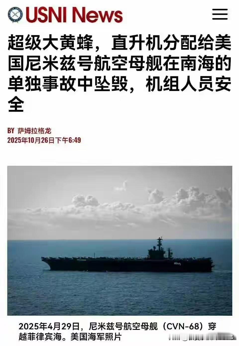 美国军队又摔飞机了,而且是在同一地点接连摔了两架。只不过这次摔机的地点颇为敏感,就在我国南海海域! 身处南海的美国尼米兹号航空母舰,近来遭遇了倒霉事儿。先是一架海鹰直升机一头扎进水里,接着一架大黄蜂战斗机也坠落下去。好在机上人员被成功打捞上来,不然可就更丢脸了! 近日,中美双方在马来西亚开展关税谈判。美国派遣航母前来本想秀一下肌肉,结果却被打脸! 这真可谓是“常在河边走,哪有不湿鞋”,更何况是在广袤的大海之上!出来混迟早是要还的,只是这代价有点大!