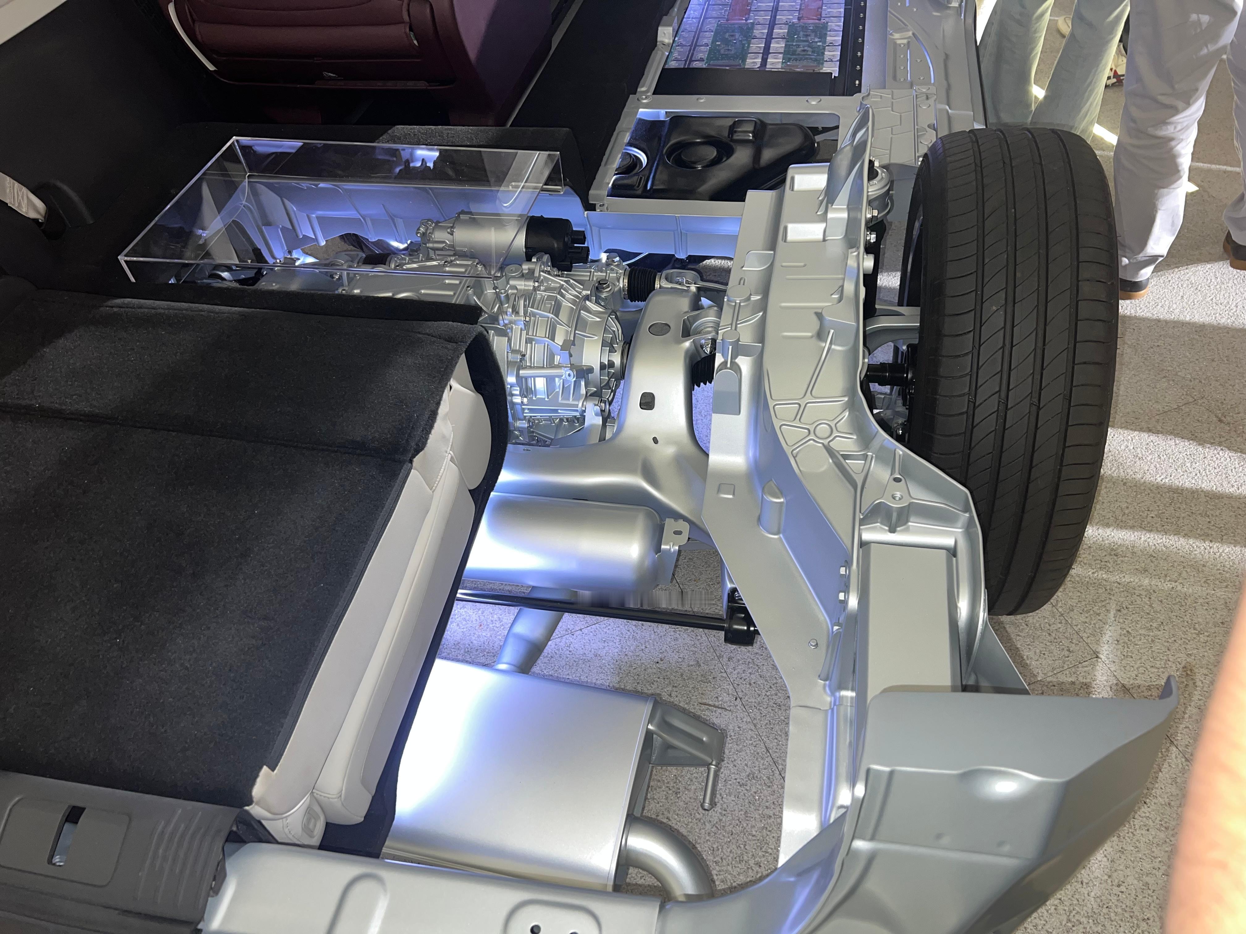 增程版210kW的后电机比纯电上135kW那台还要小一点。后电机、空悬的气罐、排气、第三排沉坑座椅全都留下了。